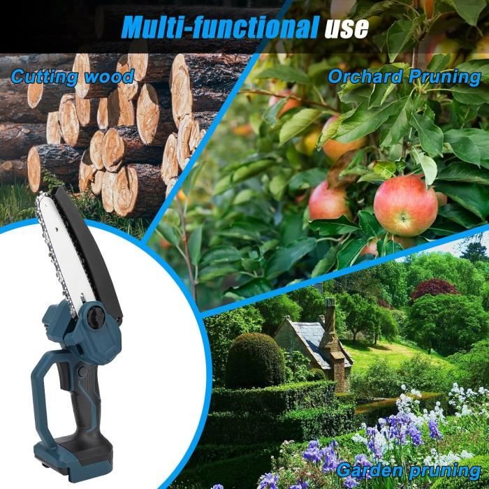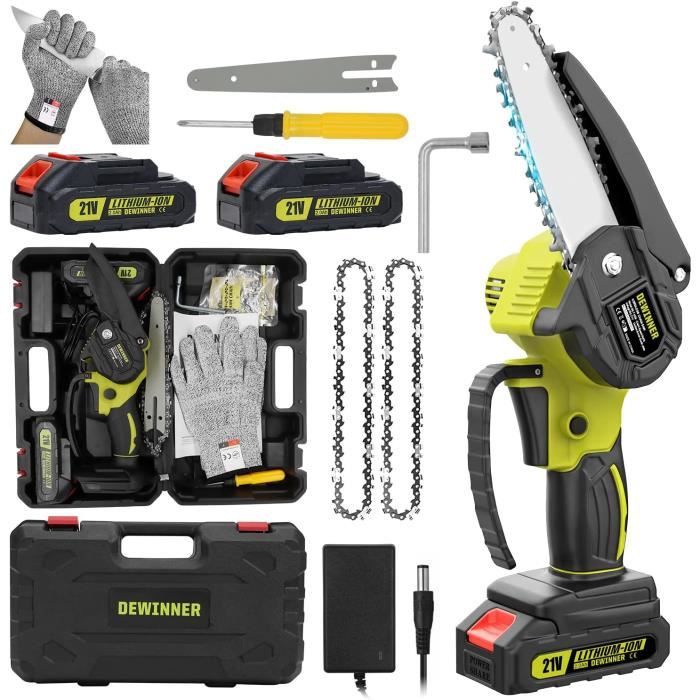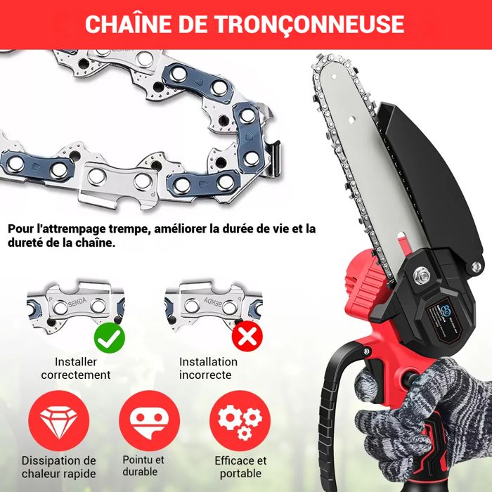 【Accessoires pratiques】Nous avons préparé pour vous : 2 batteries, 1 valise, 2 chaînes (dont une installée), 1 guide, 1 chargeur, 1 paire de gants, 1 paire de lunettes, 1 boîtier de protection, 1 manuel d’utilisation et 1 tournevis. Profitez d'une liberté de mouvement sans fil tout en réalisant un travail soigné. Les mini tronçonneuses à batterie se démarquent par leur puissance. Par exemple, la 6 pouces tronçonneuse électrique sans fil est équipée d'un moteur performant de 1000 W, idéal pour des coupes précises 【Sûre et fiable】Pour vous protéger, vous et votre famille, notre tronçonneuse à batterie pour la taille adopte les mesures de sécurité les plus strictes à trois niveaux : 1) Le verrou de sécurité empêche toute activation accidentelle (il faut appuyer sur deux boutons différents pour l’allumer). CONTACTEZ-NOUS : Connectez-vous à votre compte Amazon > cliquez sur « Vos commandes » > Trouvez l’ID de commande > Cliquez sur « Contacter le vendeur » Nous prenons vos avis très au sérieux. Ces conseils vous aideront à utiliser plus facilement la mini tronçonneuse. Nous espérons que vous les lirez attentivement. forte motivation]Cette tronçonneuse de 6 pouces intègre un moteur en cuivre pur sans balais d'une puissance maximale de 400 W, capable d'entraîner la chaîne jusqu'à 10 000 tours par minute, ce qui rend la coupe de branches ou de billes facile et rapide 3) La protection de la poignée sépare la main de la chaîne, garantissant une sécurité à 100 % DURATECH Mini Tronçonneuse à Batterie 5 Pouces, 12V Scie Électrique Scie Electrique Bois 21v Mini TronçOnneuse à Batterie 6 Pouces, TronçOnneuse éLectrique Sans Fil, TronçOnneuse 7500mah, 2 ChaîNes, Naruts, Tournevis, Pour La Coupe Du Bois, L 'éLagage Le Jardin (1 Batterie 1 Charger Mini Tronconneuse A Batterie 【Service après-vente】Dans la section « Description du produit », vous trouverez quelques conseils d'utilisation et de sécurité. 【Facile à entretenir】Nos tronçonneuses sont entièrement certifiées UE et peuvent être utilisées pendant de nombreuses années. Elles sont plus faciles à stocker et moins coûteuses à entretenir. Un simple affûtage de chaîne et une bouteille d’huile pour guide-chaîne suffisent généralement à faire fonctionner une tronçonneuse pendant des années. C’est aussi un indispensable pour chaque foyer italien., Ramenez-la chez vous