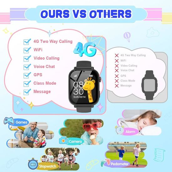Avec Magic Camera, Kids peuvent immortaliser plus beaux moments de leur enfance. En prenant des photos et des vidéos, vos Kids peuvent immortaliser leurs aventures et partager avec leurs proches directement via fonction de microchat de smartwatch. L'emploi du temps permet à votre enfant de répartir raisonnablement temps entre l'étude et loisirs, ce qui lui permet de cultiver notion de temps. Montre connectée enfant permet d'ajouter des amis en face à face. Montre connectée enfant GPS et appels vidéo, chat familial, SOS, caméra, sport, musique, mode école, jeux, réveil, boutique d'applications (Deezer/Spotify/YouTube/Traduction), verrouillage par code d'accès et plus encore. Intègre des fonctions supplémentaires : alarme, chronomètre, agenda, calculatrice, géolocalisation, appels en visio, jeux éducatifs Dotée d'un mode salle de classe et peut être mise en mode silence d'un simple clic afin d'éviter toutes notifications sonores malencontreuses Montres Connectées Enfant 4G (8-12 Ans 【Combinaison du travail et des loisirs】Montre gps enfant ne sont pas seulement amusantes, elles améliorent également l'efficacité de l'apprentissage. En outre, vous pouvez rapidement changer de cadran préféré en tournant bouton de montre connectée enfant; balayez l'écran vers droite pour accéder aux fonctions de raccourci telles que les appels et les SMS. Plusieurs jeux de puzzle et cartes d'apprentissage pour développer réflexes et capacités de réflexion de votre enfant. Vous pouvez télécharger des milliers de morceaux de musique sur montre pour que votre enfant puisse profiter du plaisir et du pouvoir de musique. Montre Enfant Jeux Et Caméra Montre Connectée Pour Enfants Avec Suivi GPS Et Caméra : Un Appareil Portable Amusant Et Fonctionnel Pour Les Enfants, Avec Appels - Téléphonie Montre Connectée Enfant 4G GPS Montre connectée enfants avec SOS] : En cas de danger ou de besoin d'aide urgent, l'enfant n'a qu'à maintenir le bouton SOS enfoncé pendant 3 secondes. La montre telephone enfant compose automatiquement et en boucle les 3 contacts d'urgence prédéfinis jusqu'à ce que l'appel soit répondu Montre gps enfant peut même se connecter au Wi-Fi, au hotspot et au Bluetooth. Ces fonctions vous permettent de réduire efficacement risque de danger potentiel et de rester en contact avec vos enfants pour assurer leur sécurité, où que se trouvent les parents. 【Un mode de vie dynamique】Pour encourager votre enfant à mener une vie active et à adopter un mode de vie sain. En cas d'urgence, activez le SOS et votre contact d'urgence sera le premier à le savoir. 【Les derniers modèles les plus polyvalents】4G montre connectée enfant construit un pont entre vous et votre enfant pour une communication quotidienne et offre sécurité et protection aux enfants. En activant mode école, enfants peuvent se concentrer sur l'apprentissage à l'école.