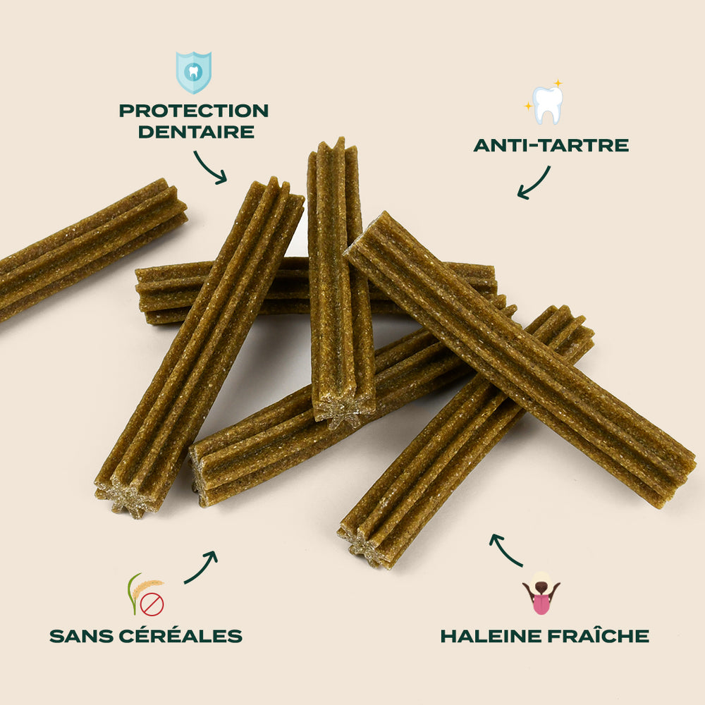 Dog Dentist Friandises Dentaires Pour Chien : Sticks Collagène - Franklin Friandises Dentaires Chien Convient à toutes les tailles et tous les âges de chiens. Haleine Fraîche pour chiens et chats - Laboratoire DEMAVIC Des sticks dentaires naturels pour une haleine fraîche et des dents saines. Formulés avec des vétérinaires pour le bien-être de votre chien Comment l'utiliser ? Vous pouvez donner un stick par jour à votre chien pour le récompenser ou lorsque vous vous absentez. MARQUE FRANÇAISE : Chez Franklin, nos recettes sont formulées par des experts en nutrition animale avec des ingrédients de haute qualité, sans OGM, ni colorants artificiels. Votre chien a mauvaise haleine, que faire MASTICATION LONGUE DURÉE : Mesurant 14 cm, ces friandises dentaires à la pomme offrent une expérience de mastication longue durée. Des dents plus blanches et des gencives protégées. Pour se régaler pendant les fêtes Riches en fibres et en prébiotiques, ils favorisent la santé intestinale. Nos friandises sont adaptées aux chiots, chiens adultes et seniors. Un stick au goût délicieux de pomme et cannelle qui agit contre la formation de plaque dentaire. PLAISIR ET PROTECTION DENTAIRE : Nos sticks dentaires pour chien allient plaisir et soin ! Les friandises agissent contre la formation de tarte et plaque dentaire grâce au mâchouillage.