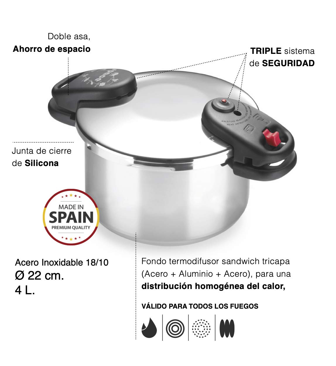 Convient à tous types de cuisines. Cocotte-minute ultra-rapide SPACE de 6 litres, fabriquée en acier inoxydable 18/10 de haute qualité. Elle dispose de deux niveaux de cuisson et d'un triple système de sécurité Super Rapide: L'autocuiseur ALZA SPACE de 6L offre 2 modes de cuisson SUPER RAPIDE (100 kPa) idéal pour les légumes secs et les viandes, et RAPIDE (60 kPa) spécialement recommandé pour les plats délicats comme les riz et les poissons. Son intérieur satiné et son extérieur poli miroir le rendent compatible avec le lave-vaisselle. 3 Systèmes de Sécurité: L’autocuiseur ALZA SPACE dispose de 3 systèmes de sécurité : valve de fonctionnement, valve de sécurité agissant en cas d’augmentation excessive de la pression, et joint + fenêtre latérale, élément de sécurité définitif. Autocuiseur 6 Litres Acier Inoxydable Alza Space - Autocuiseur Rapide 6L, Acier Inoxydable 18/10, 2 Modes De Cuisson, Design Ergonomique, Économie D'Énergie, Poignées Thermo-Résistantes Autocuiseur Rapide Alza Son échelle interne pratique permet de visualiser le remplissage précis à tout moment. Efficacité Énergétique: L'autocuiseur ALZA SPACE cuit la viande en utilisant seulement 1/15 de l’énergie calorifique normalement requise, et peut préparer les haricots rouges avec à peine 1/3 de l’énergie habituelle. Les poignées latérales thermo-résistantes assurent une manipulation confortable et sécurisée. Le fond thermo-diffuseur Sandwich (acier + aluminium + acier) permet une diffusion rapide et uniforme de la chaleur, ce qui le rend compatible avec tous types de cuisines, y compris l'induction. Quel mode de cuisson pour un airfryer Ninja Ergonomie: Le modèle SPACE d’ALZA, au lieu du classique manche à baïonnette, adopte ici une configuration avec 2 poignées opposées en bakélite thermo-résistante, ce qui permet un gain de place dans la cuisine. Autocuiseur Vitaquick Green - SANAG - 6 L, 22 Cm - 2 Niveaux De...