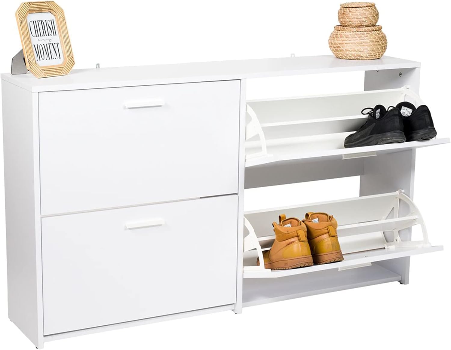 DESIGN RAFFINÉ : Ce meuble à chaussures pour l'entrée, au design moderne, est doté d'une finition lisse, de lignes finement sculptées et de poignées dorées sophistiquées, apportant une touche raffinée à votre intérieur. Armoire à chaussures d'entrée à style moderne, finition de couleur unie et poignées dorées rehaussent l'attrait esthétique - Deux tiroirs basculants du meuble à chaussures permettent de ranger jusqu'à 8 paires de chaussures Découvrez l'armoire à chaussures HOMCOM : style moderne, finition soignée, poignées dorées élégantes. SPÉCIFICATIONS DU MEUBLE À CHAUSSURES : Dimensions totales : 60l x 23,5P x 98,5H cm., Charge max. Il est soutenu par cinq pieds assurant une stabilité robuste et comprend un dispositif anti-renversement pour plus de sécurité. Son plateau supérieur est idéal pour exposer des objets décoratifs ou pour déposer vos indispensables avant de sortir. IDÉAL POUR LES ESPACES RESTREINTS : D'une profondeur de 23,5 cm, cette armoire à chaussures compacte se place idéalement dans les entrées ou couloirs étroits, optimisant l'espace disponible tout en offrant un style élégant. Idéale pour les petits espaces, elle combine esthétique et fonctionnalité dans votre entrée. Deux tiroirs basculants permettent de stocker jusqu'à 8 paires de chaussures, tandis que les étagères ajustables offrent des options de rangement flexibles Armoire à chaussures d'entrée à style moderne, finition de couleur unie et poignées dorées rehaussent l'attrait esthétique Meuble à chaussures 8 paires, armoire à chaussures Meuble Chaussures HOMCOM Meuble Chaussure Entrée étroit, Armoire à Chaussures Avec Tiroirs à Portes Abattants Et étagère Réglable, Meuble D'entrée Et Couloir 8 Paires, Pour Entrée Et Couloir 60 X 23,5 X CAPACITÉ DE RANGEMENT ÉTENDUE : Doté de deux tiroirs pivotants, ce meuble à chaussures d'entrée peut accueillir jusqu'à huit paires de chaussures, avec des étagères ajustables sur deux niveaux pour une organisation optimale. Deux tiroirs basculants du meuble à chaussures permettent de ranger jusqu'à 8 paires de chaussures Meuble à chaussure en bois compacte idéale pour les espaces étroits Fabriqué à partir de MDF peint et de panneaux de particules pour la durabilité Conception anti-basculement ajoutant stabilité et sécurité , Montage nécessaire