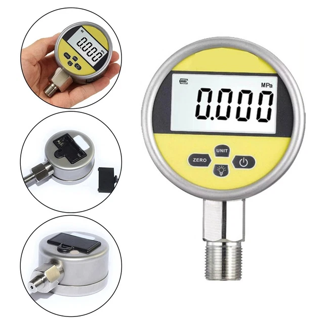 Contenu de l'emballage : 1 manomètre numérique (batterie non incluse). Moyen de mesure : eau, gaz, huile Température : -20 ℃ ~ 70 ℃. Choisir un manomètre hydraulique : conseils et astuces L'installation du manomètre est simple grâce à son interface d'installation G1/4. Assurez-vous de suivre les instructions spécifiques pour garantir une connexion étanche Design robuste : ce manomètre numérique avec écran LCD utilise des capteurs de pression importés et des composants électroniques, est de haute précision et dispose d'une extrémité de jauge en acier inoxydable 304, robuste et de bonnes performances. WIP-Manomètre numérique Manomètre de pression hydraulique numérique 1.0 Informations complémentaires : le manomètre de pétrole, de gaz et d'eau est alimenté par 3 piles AAA (non incluses) ; Plage de mesure de pression : 0-40 MPa ; Milieu de mesure : eau, gaz, huile ; Température de fonctionnement : -20°C-70°C. Le rétroéclairage est retardé de 10 secondes et s'éteint automatiquement, ce qui permet d'économiser davantage d'énergie et a une durée de vie plus longue. Manomètre Haute Précision Connecteur G1/4 Manomètre Hydraulique, 0-400 Bar 0-5800PSI G1/4 63 Mm Manomètre Acier Inox écran Lcd Diamètre nominal : environ 80 mm., Poids : 320 g. Risegun Manomètre numérique hydraulique en acier inoxydable pour eau, gaz, huile 400 bar, 0-40 MPa, 5800 PSI avec connecteur G1/4 1., Adopte des capteurs de pression importés et des composants électroniques, haute précision, adoption de l'extrémité du compteur en acier inoxydable 304., 2., Utilisation d'un écran LCD transparent avec une source de lumière de fond bleue pour le rendre plus clair la nuit., 3., MPA/PSI/Kgf/cm², plusieurs unités peuvent être commutées., Affichage, 4., Touchez le bouton, l'opération est plus facile, le rétroéclairage est retardé de 10 secondes, arrêt automatique, plus d'économie d'énergie, durée de vie plus longue, 5., Alimentation de la batterie, non limitée par le bloc d'alimentation. Spécifications: Numéro de modèle : HG-806XB Plage de pression : 0-400 bar / 0-40 Mpa / 0-5800 PSI.