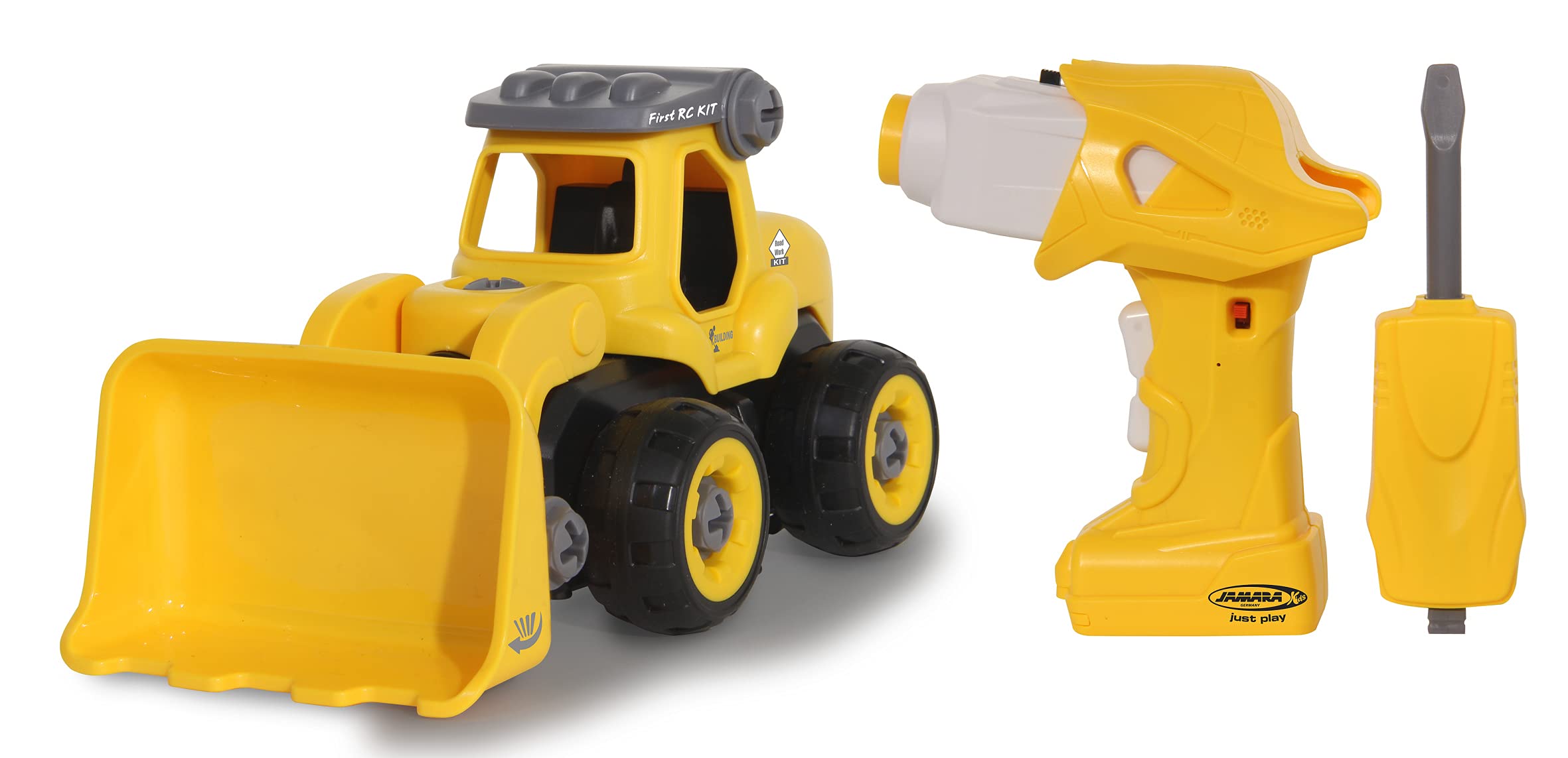 Tenir hors de portée des enfants. Ce kit de chargeur sur roues à plusieurs fonctions est incroyablement polyvalent. Un grand plaisir de construction est garanti sans aucun effort et, en même temps, la motricité fine et la compréhension technique sont encouragées Incroyablement polyvalent, ce nouveau kit de chargeuse sur pneus avec plusieurs fonctions. 2,4 GHz pour un fonctionnement multijoueur, visseuse sans fil avec embrayage à glissement, pas de serrage excessif des vis, en plastique robuste, pneus en caoutchouc, grand plaisir de construction sans effort Accessoires requis : 4 piles AA 1,5 V Favorise la motricité fine et la compréhension technique, tournevis avec insert interchangeable, unité d'entraînement pour visseuse sans fil ou modèle, sans unité d'entraînement, la visseuse sans fil devient une télécommande La chargeuse sur roues jaune vif peut être contrôlée en avant et en arrière avec RC. Kit de gonflage de pneus automatique et professionnel avec jauge Pro Contient de petites pièces pouvant être avalées. Ici, un grand plaisir de construction est garanti sans effort et la motricité fine et la compréhension technique sont également encouragées. Avertissement De Sûreté À utiliser sous la surveillance directe d'un adulte. Visseuse sans fil 3.6V BOSCH Camion Jouet Télécommandé Chargeur Sur Pneus First RC Kit De 27 Pièces Avec Visseuse Sans Fil – À Partir De 3 Ans, Embrayage Glissant, Insert Interchangeable, Plastique Jouet Construction Visseuse La pelle et la trappe de toit peuvent être soulevées et abaissées ou ouvertes et fermées manuellement.