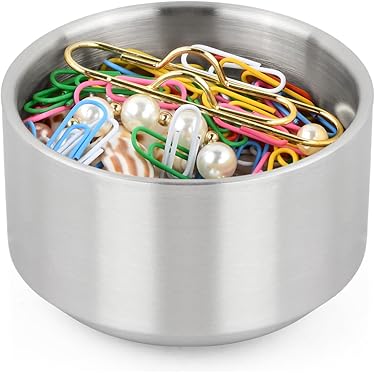 【Compact et Gain de Place】: Avec un diamètre de 9 cm et une hauteur de 5,5 cm, ce mini bol de rangement est compact mais pratique. Design Moderne et Élégant]: Choisissez parmi les variantes dorées et argentées de ce porte-clips en métal, avec un design élégant et stylé en acier inoxydable. Complète parfaitement toute décoration de bureau ou de maison, tout en ajoutant une touche de sophistication à votre espace de travail Spécifications: Matériau: Acier inoxydable de haute qualité Utilisation: Idéal pour ranger les petits fournitures de bureau tels que trombones, attaches parisiennes, punaises ou petits accessoires Dimensions: Diamètre: 9 cm, Hauteur: 5., 5 cm Couleur: Or / Argent Caractéristiques: 1., Fabriqué en acier inoxydable premium, ce bol de rangement est résistant aux rayures, robuste et durable. Parfait pour contenir des clips de papier, des clips de reliure et d'autres petits fournitures de bureau, tout en gardant votre bureau propre et organisé. Remarque : Les clips de papier ne sont pas inclus. 【Utilisation Polyvalente】: Ce bol de rangement est idéal pour les bureaux, les maisons, les écoles et plus encore. Parfait pour les bureaux, maisons, écoles ou comme élément décoratif. Trombones en acier inoxydable pour document - Your Mix Shop Conçu pour résister à une utilisation quotidienne sans compromettre son apparence élégante. Sa finition métallique élégante ajoute une touche stylée et professionnelle à n'importe quel bureau ou espace de travail., 2., Petit mais assez spacieux pour organiser des trombones, attaches parisiennes, punaises ou même des objets personnels comme des boucles d'oreilles, colliers ou barrettes. 【Matériau Premium】: Fabriqué en acier inoxydable de haute qualité, ce bol de rangement est résistant aux rayures, durable et conçu pour durer. Il est parfait pour organiser de petits objets comme des clips de papier, des punaises et des accessoires pour cheveux, apportant ordre et élégance à n'importe quel environnement Bol Métal Or Décoratif Bureau 100Pcs Or Trombones Forme Mignonne Acier Inoxydable Multifunction Métal Trombones Pour Bureau D'Étude à Domicile Avec Boîte De Rangement Organiseur Trombones Acier Inoxydable Complète parfaitement toute décoration de bureau ou de maison, tout en ajoutant une touche de sophistication à votre espace de travail.