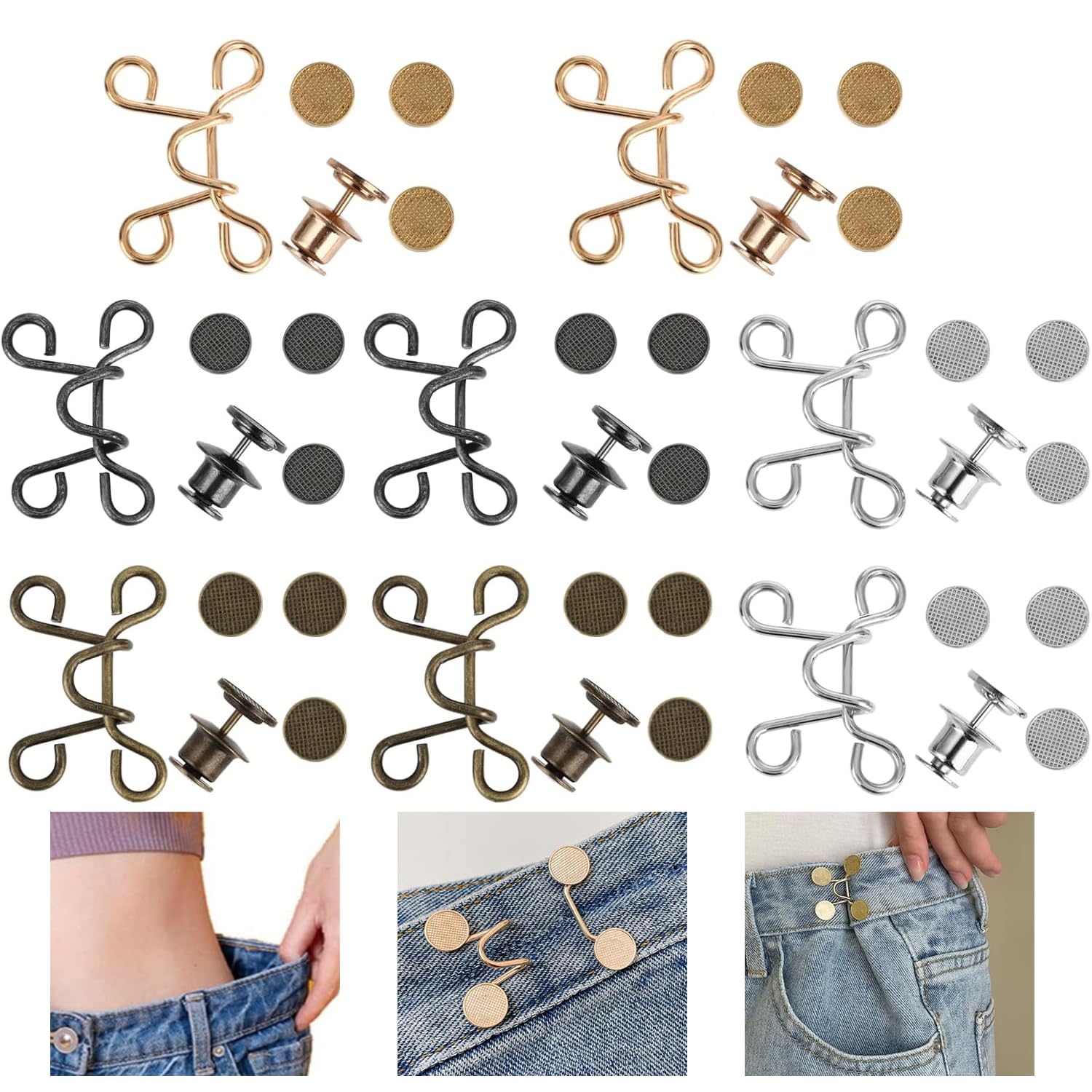 ajustement instantané de la taille de 2 - 3 cm. Avec seulement 20 grammes de conception ultra - légère, caché sans ballonnement, l'emballage écologique de l'UE est sûr et sans tracas. Description du produit : 8 Paires de jolis boutons en forme d'ours pour jeans, à fixer sans couture, boucles détachables pour resserrer la taille, cadeaux parfaits pour les filles et les femmes pour jupes, pantalons et jeans Si vous avez du mal à trouver des jeans qui s'adaptent à vos hanches et cuisses mais qui sont trop grands pour votre taille, ces boutons de jeans sont faits pour vous Vous pouvez également servir de boucles décoratives pour les sacs à dos, les chapeaux, les vêtements de loisirs et d'autres accessoires pour réaliser une chose polyvalente. Lot de 8 paires de broches à bouton pour jeans en forme de Dans le même temps, l'or, l'argent, le noir pistolet, le bronze quatre couleurs sont disponibles, mieux correspondre facilement à toutes sortes de styles vestimentaires. La conception à haute résistance résiste à une utilisation quotidienne fréquente et assure une solidité à long terme. Boucles Pour Vêtements RichLuck Lot De 8 Paires De Boutons Pour Jeans Amples, Serre-taille En Forme D'étoile, Extension De Boucle De Taille Réglable, Serre-taille Réutilisable Pour Pantalons Sans Couture (4 Couleurs Boucles De Jeans Clipsettes Conception originale de fente de carte antidérapante pour s'assurer que les activités intenses ne tombent pas non plus. Paramètres techniques Matériau : alliage de haute qualité, anti-oxydation et anti-usure, durable Taille : diamètre 1,5 cm, épaisseur 0,3 cm, petit et invisible, convient à la plupart des vêtements Poids : environ 7 g, léger Couleur : or/argent/fusil/bronze, quatre couleurs au choix Guide d'utilisation Positionnement : Placez la partie supérieure des crampons sur le côté intérieur du vêtement, et la partie inférieure des trous sur le côté extérieur Bouclage : Appuyez fortement pour aligner la position, et lorsque vous entendez le clic, il est verrouillé avec succès Ajustement : Il est recommandé d'en installer un tous les 3 cm d'intervalle, pour obtenir un effet de taille uniforme., Conseils I. Conseils d'entretien : 1, essuyez à temps après l'eau pour maintenir l'éclat 2, il est recommandé d'enlever temporairement les boucles avant de nager ou de faire de l'exercice physique intense Deuxièmement, attention à l'utilisation : 1, pas pour la soie ultrafine, la dentelle et d'autres tissus fragiles 2, ne pas utiliser pour porter des charges (par exemple, suspendre des objets lourds) Troisièmement, utilisation créative de 1, mélangez et associez différentes couleurs pour créer des décorations personnalisées (comme la décoration de la boucle du sac en jean) 2, peut être utilisé pour fixer temporairement des écharpes, des ourlets et d'autres situations d'urgence.