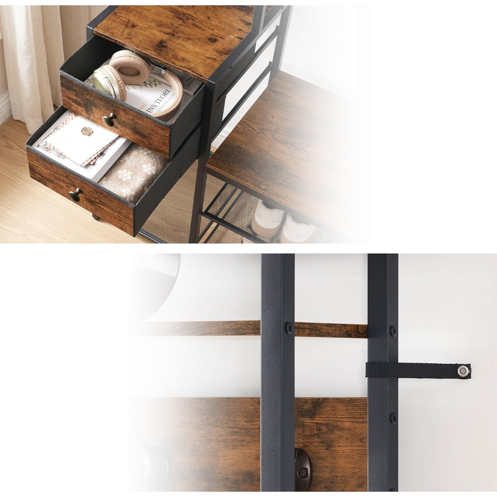 Les chochets amovibles répondent également à d’autres besoins de suspension 1 Crochet multifonctionnel 2 Crochet amovible 3 2 tiroirs en intissé 4 Structure Solide 5 Anti-basculement Meuble de rangement pour l'entrée en 35 idées magnifiques Porte-manteau,avec Banc Et Étagères À Chaussures, Hauteur 175 Cm... Rangement supplémentaire : L’espace en haut et les trois étagères latérales vous offrent un espace supplémentaire pour exposer des objets décoratifs ou des sacs. Meuble d'Entrée, Vestiaire, Porte-manteau avec Banc, avec Crochets, Étagère Réglable, Moderne De plus, les deux tiroirs en non-tissé peuvent ranger des clés et autres petits objets Solide et durable : Fabriqué en panneaux d’aggloméré de qualité et en cadre métallique, ce meuble est stable et a grande capacité de charge. Rangement Chaussures étagères Tiroirs Entrée Meuble D'entrée De Rangement Porte Manteau Vêtement Avec étagères à Chaussures Et Crochets 60cm Porte Manteau Banc Chaussures Les deux côtés disposent de 3 étagères avec espacements différents pour ranger des chaussures et des bottes Pourquoi choisir l’étagère d’entrée polyvalente de HOOBRO ? Intégré les étagères de rangement, les crochets, le porte-manteau, l’organisateur et le banc à chaussures, ce meuble d’entrée offre une solution parfaite pour vos besoins de rangement dans l’entrée et maintenant l’espace bien organisé. Renforcé à l’arrière par des barres en forme de X, ce qui lui confère une stabilité supplémentaire.