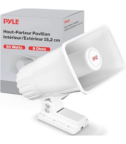 EXCELLENTE RÉPONSE EN FRÉQUENCE : Efficace pour obtenir la réponse souhaitée, ce haut-parleur de 6 peut amplifier de 500 Hz à 5 kHz. Haut-parleur Pyle 6 à 50W, parfait pour l'intérieur et l'extérieur. Son puissant et clair, support de montage inclus. Commandez maintenant Le haut-parleur PA PyleHome PHSP4 de 6 pour intérieur/extérieur est la solution parfaite pour amplifier votre son dans des environnements intérieurs et extérieurs. Il produit un son puissant de 50 watts, suffisant pour atteindre le volume désiré. Le haut-parleur pèse seulement 1,78 lb et mesure 6 H x 4 L x 8 P. SUPPORT AJUSTABLE : Le haut-parleur à cornet peut être plié et ajusté. Son éventail de fréquences de 500 Hz à 5 KHz offre un spectre sonore complet, et ses 100 dB SPL assurent que votre voix ou musique soit entendue clairement, même à distance. Pyle Enceintes 3 Voies Extérieures Marine 8,9 cm – Paire de Haut-Parleurs 200W Blancs pour Intérieur/Extérieur – Idéal Bateau, Terrasse, Jardin, Piscine – Son Puissant Résistant Idéal pour améliorer votre système de sonorisation PA, le PyleHome PHSP4 garantit un son clair et puissant, assurant que votre message soit entendu. Avec une puissance de 50 watts et une impédance nominale de 8 ohms, ce haut-parleur garantit un son clair et puissant pour les systèmes de sonorisation. Son format compact de 6 H x 4 W x 8 D le rend polyvalent et facile à monter où vous en avez besoin. Avec une puissance de 65 watts et une impédance nominale de 8 ohms, ce haut-parleur garantit un son puissant et clair dans tous les environnements. Son éventail de fréquences de 500 Hz à 5 KHz permet une large gamme de son, et ses 101 dB SPL à 1W/1m assurent que votre voix ou musique soit clairement entendue à longue distance PyleHome PHSP4 50W Pyle Haut-Parleur PA Intérieur/Extérieur - Haut-Parleur PA De Corne Ampli Voix Conçu pour une installation facile, ce haut-parleur comprend un support de montage et des accessoires, permettant de l'installer rapidement dans divers endroits.