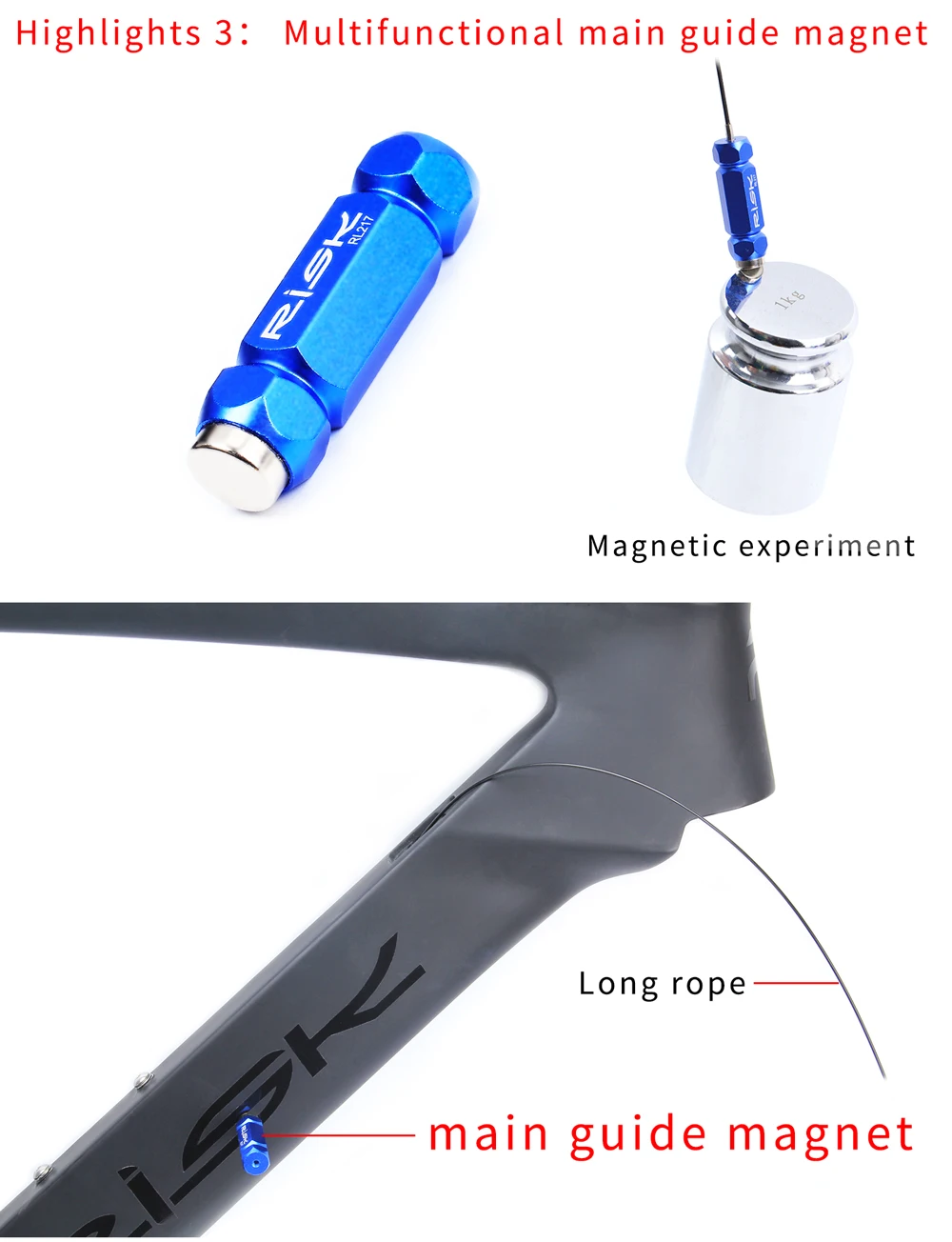 Le fil ⑤ et le fil ⑥ s'attirent mutuellement parce qu'ils sont les pôles positif et négatif. Nous proposons 3 adaptateurs pour l'installation de tuyaux de ein, de tuyaux de changement de vitesse, de tuyaux hydrauliques, de c bles internes, de c bles lectriques, etc. Remarque cet outil de routage des c bles internes de v lo ne fonctionne pas avec les cadres en acier Comment utiliser l'outil d'acheminement interne des câbles de vélo ? Comment utiliser ces pièces ? 6+1., : L'adaptateur en caoutchouc à traction rapide (1) s'adapte à un tuyau métallique de 4 ~ 5,5 mm, un tuyau d'huile, un fil électrique. Remarque : cet outil de routage des câbles internes de vélo ne fonctionne pas avec les cadres en acier. L'aimant principal possède une force magnétique puissante qui guide votre câble interne (ou durite de frein, câble électrique, etc. arrêter les fuites d'huile (juste le tube d'huile de frein de vélo a besoin) 1., Envoyez le tube d'huile de frein de vélo dans le cadre jusqu'à ce que le tuyau d'huile passe à travers l'extrémité du trou 2., Coupez 10 mm à l'extrémité du tuyau d'huile qui se connecte au guide à long aimant Le câble intérieur en acier inoxydable revêtu de polymère réduit la résistance au glissement pour obtenir un fonctionnement léger et plus rapide et résiste à la rouille. Le câble intérieur en acier inoxydable revêtu de polymère réduit la résistance au glissement pour obtenir un fonctionnement léger et plus rapide et résiste à la rouille Long guide magnétique (6) Tirez-le dans le cadre et exportez-le hors du cadre. BESNIN kit routage interne velo Outil de routage interne de câble de Outil Câblage Vélo Outil De Routage De Câble Interne De Vélo, Levier De Vitesses De Fil Aimant Guidage Câble Frein Dérailleur adaptateur en caoutchouc de traction L'adaptateur en caoutchouc à traction rapide peut être utilisé pour connecter rapidement des câbles internes, des tubes, Di2, etc. Comment utiliser les pièces une fois qu'elles sont connectées avec succès ? 1., Une fois l'extrémité de l'aimant du long guide d'aimant⑥ dans le cadre, utilisez l'aimant principal⑦ pour attirer l'aimant de ⑥ pour se déplacer dans le cadre., 2., Lorsque vous vous déplacez vers la sortie, connectez les vis à l'extrémité du guide magnétique court ⑤ à l'extrémité de l'aimant principal ⑦, utilisez l'extrémité magnétique du guide magnétique court ⑤ pour attirer l'extrémité magnétique du guide magnétique long ⑥ et exportez-le hors du cadre. Pour plus de détails sur l'utilisation, vous pouvez vous référer à notre vidéo ou à nos photos. Les fils ⑤ et les maîtres aimants ⑦ s'excluent mutuellement parce qu'ils sont tous deux positifs. Le fil ⑥ et les maîtres aimants ⑦ s'attirent mutuellement parce qu'ils sont des pôles positifs et négatifs.