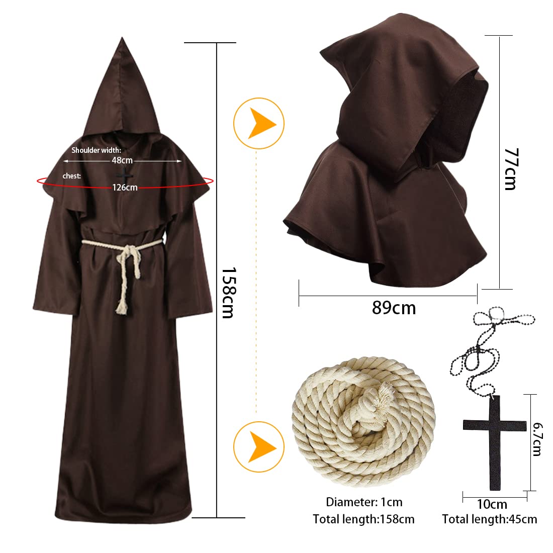 Il peut également être utilisé comme cape de sorcier, robe de prêtre médiéval, costume de médecin de la peste, robe de monastère, fantôme costume de prêtre. 【Emballage inclus】La robe à capuche médiévale comprend : une robe*1, une cape à capuche*1, une croix*1, une corde à la taille*1, un chapeau peut couvrir votre visage, le design mystérieux vous fera vous démarquer lors des fêtes d'Halloween et de carnaval. 3 pièces Set de Moine avec Collier et Cordon de Taille pour Adulte, Robe de Moine Capuchon, Costume de ère Médiéval à Capuchon, Robe de Prêtre Renaissance, Costumes d'Halloween pour Hommes, Déguisement pour Halloween et Carnaval Ce costume de moine est parfait pour une soirée costumée ! Le tissu, plutôt fin, est parfait pour être porté au-dessus de vos vêtements habituels sans devenir une étuve, ce qui permet de porter le costume plus longtemps, toute la soirée si nécessaire 【Taille du style】notre prêtre moine costume de capuche médiévale est disponible en 4 tailles : M, L, XL et XXL. illennius Costue édiéval Fee Grande Taille édiévale Déguiseent Veuillez suivre notre tableau des tailles pour choisir votre taille. (L'image 2 montre le tableau des tailles) Robe Médiévale Deguisement Moine, Obe De Moine Adulte, Obe De Enaissance Medievale Avec Capuche Ceinture Et Croix Costume D Halloween Homme Robe De Pretre Pour Halloween Cosplay Carnaval Queue De Sirene Adulte 【Scénario d'utilisation】Le costume de moine médiéval est parfait pour le carnaval, Halloween, les banquets médiévaux, les événements médiévaux, la Renaissance, les soirées à thème, etc. Le design mystérieux attirera tous les regards lors des fêtes d'Halloween et du carnaval. Avertissement De Sûreté pas d'avertissement