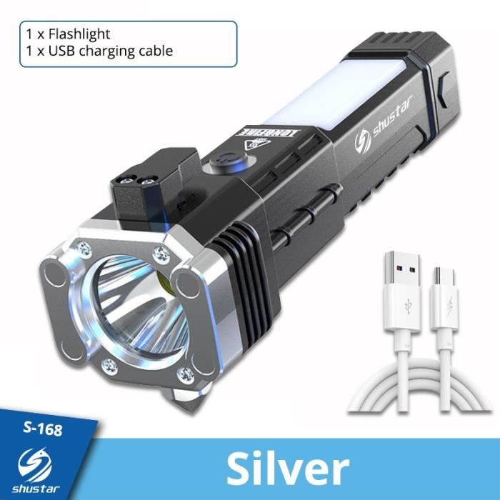 Lampe de poche multifonctionnelle, lampe solaire rechargeable, marteau Poing Americain URAQT Marteau De Su00e9curitu00e9 Pour Voiture, Brise Vitre Avec Outil De Coupe Ceinture Et Marteau De Sauvetage Pour Les Bus, Avec Socle, Nouveau Marteau D 'urgence Pour Voiture Pour Sauver Outil d'urgence polyvalent: plus qu'une simple lampe, c'est un outil d'urgence crucial qui combine les caractéristiques des marteaux d'éclairage et de sécurité, ce qui en fait un ajout essentiel à l'équipement de sécurité de votre voiture. Contenu : 1 lampe de poche rechargeable pour voiture 1 boîte de rangement 1 câble USB Astuce pointue pour briser les fenêtres et utiliser comme marteau de sécurité. Outil d'urgence polyvalent : Bien plus qu'une simple lampe, c'est un outil d'urgence essentiel qui combine éclairage et marteau de sécurité, un ajout indispensable à votre équipement de sécurité automobile Haute luminosité: Avec une lumière blanche brillante de 6000k, cet outil propose plusieurs modes, un clignotement haut, bas et SOS. Elle est équipée d'une lampe torche brise-vitre et d'un coupe-ceinture pour couper la ceinture coincée et briser la vitre latérale en cas de blocage, vous offrant ainsi une chance de vous échapper d'une situation dangereuse Cette polyvalence répond à divers besoins d'éclairage dans différentes situations. Conception innovante: ce Duster Knuckle propose une lumière LED intégrée, permettant un meilleur contrôle et un meilleur éclairage.