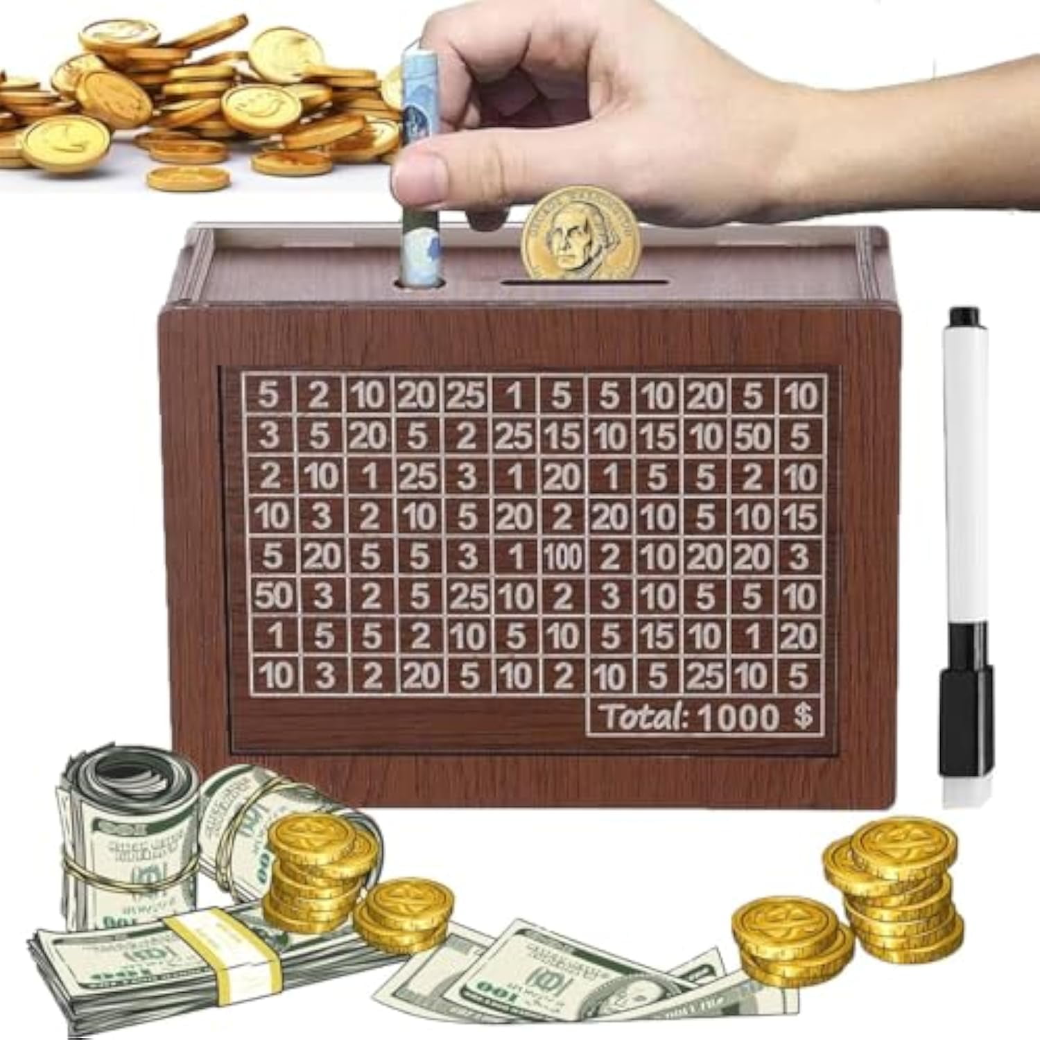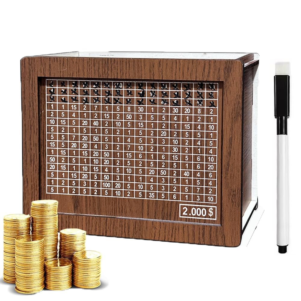 Ease of use:the design of adult piggy bank and coin slot conforms to daily use habits,the display area of coin stacking directly reflects savings achievements,and the erasable feature of whiteboard pen supports repeated marking to avoid waste and meet long-term use needs Appearance and material:the wooden cash box of cash safe is made of natural wood,showing warm brown grain texture,delicate texture and environmental protection,which can be easily integrated into various home styles,with a long and narrow coin slot at the top to facilitate coin input Functional design:wooden saving challenge box,the core of which is positioned as a challenging saving tool,helps users to establish saving habits through visual design,and the matching whiteboard pen can be recorded on a transparent plastic sheet or panel,making it convenient and flexible to adjust the plan Specifications and accessories:Reusable saving challenge box,the main body of which is a wooden frame,including a saving box body,a erasable whiteboard pen,a manual and various denominations,covering the diversified needs from daily small savings to long-term large-sum goals Boîte à économies Défi Money Saving Box Cash Box 10K Savings Challenge Box - Wooden Money Saving Tracker With Erasable Pen Piggy Bank For Kids Alcancias De Dinero Para Adultos Coffret épargne En Bois Caja De Ahorro 500 $10000 Money Saving Challenge Box Cash Vault Wooden Savings Box Cash Saver Box Saving Challenge Suitable crowd and scene:coin bank with scale,singles or couples set personal savings goals,couples enhance interaction through challenging to save money,and encourage persistence through visual progress,It is not only a practical storage box,but also a small desktop decoration