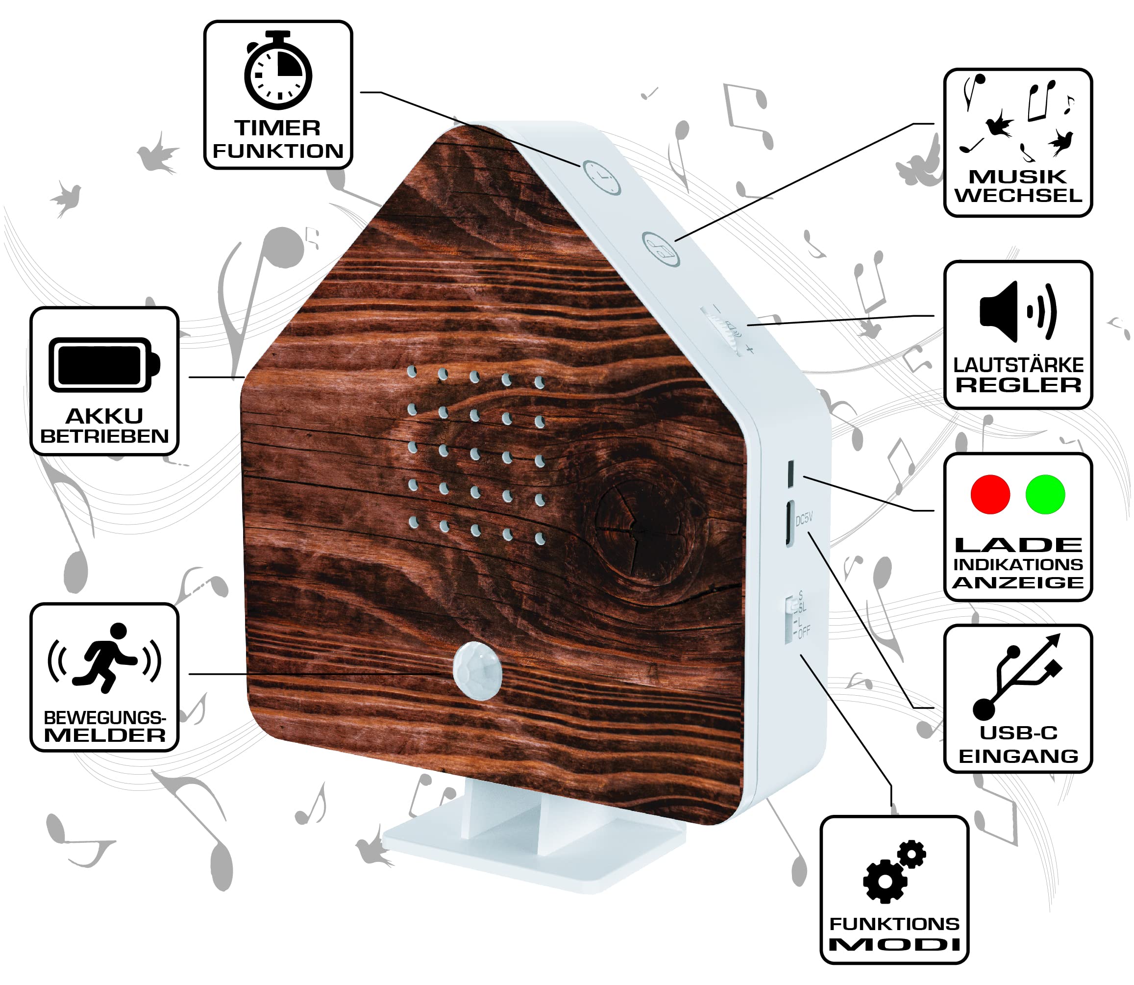 La bibliothèque des haut-parleurs chantants d'oiseaux comprend des appels d'espèces rares et familières, pour inspirer le calme et la joie Oiseau avec élastique : Comment Muscler ses épaules avec L'Oiseau avec élastique Boîte sonore pour oiseaux | Boîte à oiseaux chantante avec détecteur de mouvement | Machine intelligente polyvalente à bruit animal pour la détente dans la chambre, la cheminée et le salon Créez une atmosphère amusante avec le haut-parleur chantant des oiseaux, une machine intelligente polyvalente à bruit animal. La base équilibrée empêche les risques de basculement dans les cuisines bien remplies Installation rapide : ce haut-parleur chantant d'oiseau est conçu pour une installation rapide et facile sans avoir besoin d'outils supplémentaires ou d'expertise technique. Système naturel d'amélioration du sommeil : optimisez votre régime de relaxation avec la sortie audio neurologiquement apaisante de ce haut-parleur de chants d'oiseaux. Conçu pour les salles de bains, les spas, les salons et les chambres d'amis, il disperse les chorus d'oiseaux réalistes pour cultiver des atmosphères apaisantes ou revigorantes Oiseau décoratif à détecteur de mouvement 7x6xH9,5 cm Dimensions du produit : environ 12 x 12 x 4 cm. Northpoint Boîte à bruit naturel pour oiseaux, chant, oiseaux, détecteur de mouvement, bruit d'oiseaux, lumière rechargeable, avec support mural, feuille de palmier Bruit De La Mer Boîte Chantante Pour Oiseau, Boîte à Son Avec Détecteur De Mouvement, Son D' Oiseau, Machine à Bruit Intelligente Polyvalente Pour Chambre à Coucher, Aide Au Sommeil Avec Bruit Blanc Naturel Pour Musique D'ambiance Détection de mouvement automatique : le haut-parleur chantant des oiseaux dispose d'un capteur intelligent intégré qui détecte intelligemment les mouvements dans sa plage de détection, déclenchant automatiquement des sons authentiques d'oiseaux pour créer une ambiance naturelle immersive Matériau : bois, polypropylène. Alimentation : 3 piles AA (sans piles). Contenu : 1 haut-parleur chantant oiseau. Ambiance sonore naturelle : améliorez votre environnement avec des chansons d'oiseaux de qualité studio qui reflètent l'acoustique authentique.