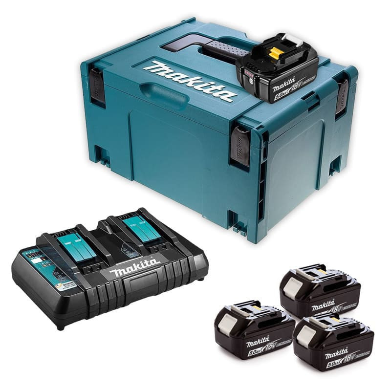 Makita 18 V Power Source Pack Énergie avec 2x Batteries 1,5 Ah + Chargeur DC 18 RC + Boîtier de Pack Makita MAKITA Pack 4 Batteries 18V 6Ah + Chargeur DC18RD + MakPac - 198091-4 Batterie Makita Pack 4 batteries BL1860B DC18RD Makpac MAKITA - 198091-4 Description du produit Pack 4 batteries 18 V Li-Ion 6 Ah avec chargeur double DC18RD et coffret MAK-PAC Pack 4 batteries 18 V Li-Ion 6 Ah avec chargeur double DC18RD et coffret MAK-PAC Le Pack 4 batteries 18 V Li-Ion 6 Ah avec chargeur double DC18RD et coffret MAK-PAC de Makita est une solution d'alimentation pour les outils électriques compatibles avec les batteries Makita de 18 V. Avantages pour l'utilisateur Pack énergie 18V Li-Ion (4x5,0 Ah) avec chargeur double dans MaKPac - MAKITA - NFD Distribution Les batteries sont équipées d'un circuit de protection qui protège contre la surcharge, la décharge excessive et la surchauffe, ce qui contribue à prolonger leur durée de vie et à assurer leur sécurité d'utilisation. Ce pack est idéal pour les professionnels et les bricoleurs qui utilisent fréquemment des outils Makita alimentés par des batteries de 18 V. Avec quatre batteries de haute capacité et un chargeur double, vous avez toujours une source d'énergie fiable à portée de main pour vos projets Avec quatre batteries de haute capacité et un chargeur double, vous avez toujours une source d'énergie fiable à portée de main pour vos projets. Il est également livré avec un chargeur double de type DC18RD, capable de charger deux batteries simultanément.