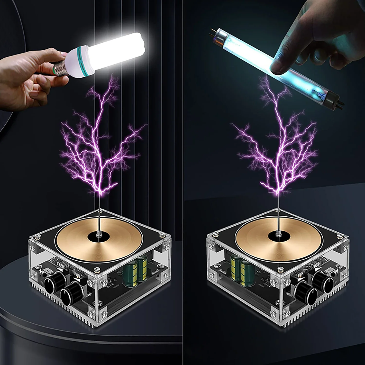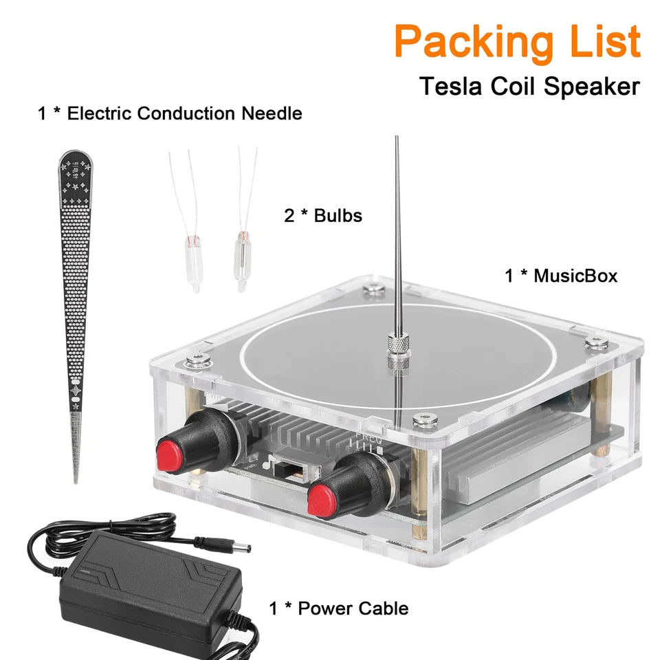Applications larges : l'arc de bobine Music peut être largement utilisé dans l'enseignement de la physique, les expériences scientifiques, les concours électroniques, les projets de remise des diplômes, les cadeaux d'anniversaire, etc. KKnoon Version BT Multifonctionnel Électronique Mobile Musique Tesla Bobine Module Foudre Artificiel Générateur D'arc Électrique Transmission Sonore Sans Fil Science Experimental Jouet Aides Bobine Tesla de musique Bluetooth, générateur d'arc d'écart d'étincelle de foudre artificielle tactile, Transmission sans fil de Plasma d'arc de jouet de bureau Multifonctions : le générateur d'arc dispose d'une transmission sans fil et d'une fonction haut-parleur pour allumer des néons et diverses bulles, pour les personnes qui apprennent les mystères de la science et de la physique. spécification Type d'article : Arc à bobine musical Matériau du produit : PCB, acrylique, alliage d'aluminium Couleur : Noir Longueur de l'arc : 0-10 cm/0-3,94 pouces (réglage par commutateur rotatif) Puissance : 0-100 W NUSIGN – calculatrice grand écran, double alimenta... – Grandado Bonne qualité sonore : une fois branché, il jouera une mélodie incroyable, la qualité de lecture de la musique est meilleure que celle des haut-parleurs plasma incurvés, sautant au rythme de la musique. Avis 1., Ne convient pas aux personnes possédant des appareils médicaux électroniques., 2., Ne touchez pas la pendant que vous travaillez., 3., Veuillez ne pas utiliser cette dans un environnement contenant des matériaux inflammables et explosifs ou des bobines fermées et des métaux de grande taille. Bobine Tesla Musicale Vislone Haut-parleur Portable De Bobine Tesla Haut-parleur BT Générateur De Foudre Artificielle Générateur D'arc électrique Expérience Scientifique Tesla Bobine Générateur Arc électrique