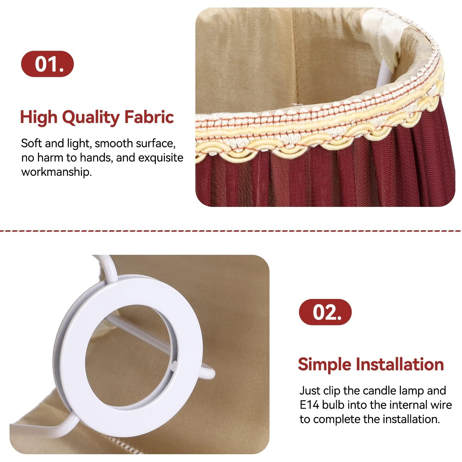 Lot de 6 Abat-jours E14 pour Lampe de Chevet Abat-jour en Tissu Petits pour Lampe Murale en Cristal Abat-jour à Clipser pour Lampes de Table Lustre en Cristal 14x9x13 cm LUMIÈRE CHAUDE ET CONFORTABLE : Diffusant doucement la lumière pour une ambiance relaxante, ce petit abat-jour adoucit la lumière, les petits abat-jours à clipser réduisent les regards agressifs et créent une atmosphère chaleureuse et confortable dans n'importe quelle pièce Abat Jour Lampe Chevet Eastlion Lot De 2 Abat-jours E14/E27 Pour Lampe De Table Applique Murale, Lustre,Abat-jour En Cristal,10 Cm (Haut) X 14 Cm (Hauteur) X 16 Cm (Bas),Flower Abat-jour Lampe Table Chevet 15 x 14 x 11 cm/5,91 x 5,51 x 4,33 pouces Ampoule applicable : E14, lustre à bougie Type d'installation : à clipser Champ d'application : convient pour le calibre E14, le lustre à bougie, pas pour les ampoules boule, ampoule ronde, ampoule spirale, ampoule tige et autres grandes ampoules., Poids : env., 450g/15., 87oz LISTE DES PACKAGES : 3 x Nuances de lustre MATÉRIAU EN LIN : L'abat-jour est fabriqué en lin pur de haute qualité. Augmentez l'attrait extérieur de votre maison avec ces élégantes lampes de table L'installation de notre abat-jour est un jeu d'enfant – il suffit de fixer l'ampoule avec le clip en fer. Il est compatible avec les ampoules E14 et peut être facilement fixé aux lustres, lampes de table, lampes murales, lampadaires, etc. Transformez votre espace en un rien de temps Abat Jour Pour Luminaire Petit Abat-Jour, 3 Pièces Abat-Jour En Tissu, E14 Clip Sur Abat-Jour Abat Jour Lampe Chevet Cet abat-jour de lampadaire est suffisamment polyvalent pour s'adapter à une gamme de paramètres ABAT-JOUR À CLIP : Les abat-jours à clipser E14 sont conçus avec une structure sûre pour assurer la dissipation de la chaleur. LARGE GAMME D'APPLICATIONS : Les appliques rondes en tissu conviennent aux lampes de table, aux suspensions, aux appliques murales, aux ampoules de lustre, aux suspensions, aux lampadaires.