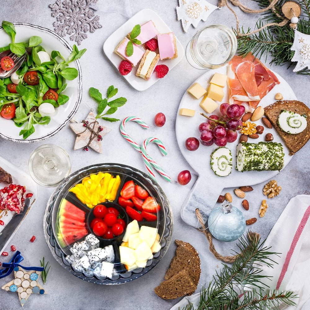 Support de Plateaux/Couvercles 6 Compartiments SECTOR de Metaltex. Couleur Blanc Épaisseur du corps de la boîte + technologie de rigidification des bords, le stockage empilable n'est pas facile à déformer, et il est résistant à l'extrusion pendant le transport. 10 Pcs Plateau Apéritif Rond en Plastique avec Couvercle Plateau de Service Divisé Conteneurs de Stockage Alimentaire Jetables Plateau de Fruits Plateaux de Légumes pour Fête et Buffet, Collation pour Enfants Noir Contenu de l'emballage : nous vous fournissons 10 plateaux à compartiments avec couvercles et 100 fourchettes à fruits transparentes emballées individuellement, chacune avec un diamètre de 31,5 cm et une hauteur de 5 cm. Nettoyage pratique et rangement compact : prend en charge le rejet unique (sans nettoyage) ou le rinçage à l'eau propre pour la réutilisation, s'adaptant à différentes exigences de scène ; les plateaux de restauration vides peuvent être empilés étroitement et les couvercles peuvent être empilés séparément. 【Couverture complète de scène】 Convient pour les fêtes d'anniversaire, les pauses thé de mariage, les pique-niques et le camping, les buffets d'entreprise, les magasins de fruits et d'autres scènes. Zonage et design avec couvercle : cinq compartiments indépendants et une zone centrale de sauce sont conçus pour éviter l'odeur des fraises, des myrtilles et d'autres ingrédients, et la vinaigrette ou les noix peuvent être placés séparément dans le compartiment central. WRENYZK Lot de 10 plateaux à compartiments avec couvercles... Boîte à Goûter à 10 Compartiments, Plateau Compartimenté Avec Couvercle Et Poignee Comprenant 1 Cuillere Et 1 Fourchette Ideale Pour Les Voyages Les Pique Niques Le Camping Et Le Gouter 90495734 Le couvercle transparent peut clairement voir les points alimentaires dans le plateau de serviette, et la boucle serrée empêche la poussière et les moustiques d'envahir, et l'étanchéité et la conservation sont plus durables Les marchands peuvent stocker des marchandises en lots pour économiser de l'espace de stockage, et il est également pratique pour empiler et ranger pour un usage domestique Le design de séparation à six grilles est adapté pour une variété de fruits et de collations, adapté pour les dîners de famille, le partage du thé de l'après-midi au bureau, l'emballage de fruits à emporter et les petites assiettes prêtes à manger, ce qui est super pratique à démonter et à utiliser