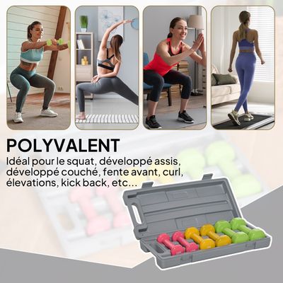 Möchten Sie auch zu Hause trainieren? Dann probieren Sie dieses Hantel Set von HOMCOM. Avec cet ensemble d'haltères courtes (total de 6 kg, paires de 0,5 / 1 / 1,5 kg), vous disposez d'une sélection illimitée d'exercices de musculation pour un entraînement efficace à la maison Sie sind mit Gewichten von 0,5 kg, 1 kg und 1,5 kg erhältlich, um Ihren Bedürfnissen nach Training mit unterschiedlicher Intensität in verschiedenen Übungsphasen gerecht zu werden. Farbige Kurzhantel: Dieses 6kg Hantelset mit hellen Farben und leicht ablesbaren Zahlen (0,5kg, 1kg, 1,5kg) erfüllt Ihren Bedarf an Krafttraining in verschiedenen Übungsphasen 2 x 0,5kg, 2 x 1kg, 2 x 1,5kg Haltères Poids 0.5 1 1.5 Kg Haltères Courts Réglables 20kg - ScSPORTS® - Musculation Fitness - Noir Lot Haltères Poids Variables Beschreibung:● Multi-Funktional, geeignet für Heben, Cardio, Yoga, Kniebeugen usw. Koffer inbegriffen: Der Transportkoffer des Kurzhantel Sets erleichtert den Transport auf Reisen. Dies ist das optimal Geschenk für Ihre Familie oder Freunde, Übung jederzeit und überall ● 3 Paar bunte Hanteln, 0,5kg, 1kg, 1,5kg, befriedigt Ihre verschiedenen Krafttraining Bedarf in verschiedenen Übungen Bühne● Helle Farben und leicht lesbare Zahlen der verstellbaren Hanteln bringen mehr Spaß in Ihr Fitness● Konstruiert dieses Hantelset aus hochwertigem Stahl mit Kunstleder-Abdeckung reduzieren die Korrosion und Lärm● Inklusive Koffer, für die bequeme Mitnahme auf Reisen● Abgerundetes Design in Achteckform verhindert das WegrollenTechnische Daten:● Farbe: Rosa+Violett+Kaffee● Material: Stahl, Kunstleder, Kunststoff● Gesamtmaße (Box): 43L x 18B x 7,5H cm● Hantel-Abmessungen: 12,5L x 5B x 5H cm (0,5 kg), 13L x 6B x 6H cm (1 kg), 15L x 6,5B x 6,5H cm (1,5 kg)● Gewicht: 2 x 0,5 kg, 2 x 1 kg, 2 x 1,5 kgLieferumfang:● 1 x Hantelset● 1 x Koffer DH FitLife Haltères réglables - Lot de 2, poids variable de Multifunktion: Die Kurzhanteln eignet sich für Heben, Cardio, Yoga, Kniebeugen und Hocke, ideal für das Training von Körper oder Zielmuskelgruppe Gymstick (ensemble de 10 pièces) Ensemble d'haltères réglables de 15 kg