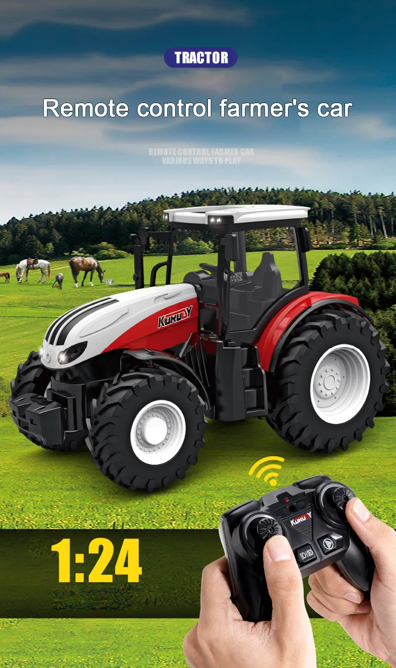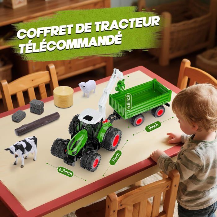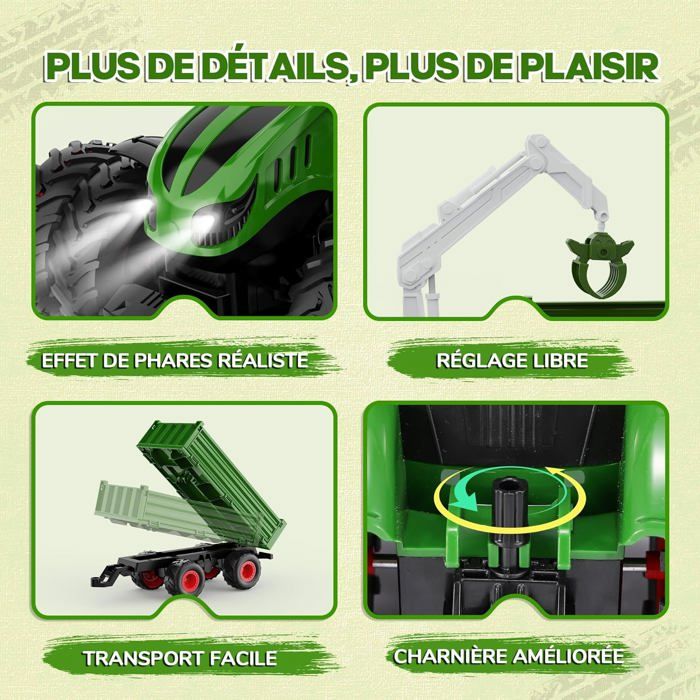 En appuyant simplement sur la télécommande, les enfants peuvent soulever et vider la remorque. Avec ses détails réalistes, son fonctionnement simple, ses nombreux accessoires et sa benne électrique à levage automatique, il procure une expérience immersive de conduite et de chargement. Les enfants peuvent combiner librement les accessoires, nourrir les animaux ou transporter du foin et découvrir la vie à la ferme en s’amusant 🏡【Design Hautement Réaliste】Cet tracteur enfant se distingue par des détails inspirés des vraies machines agricoles. Chaque partie du jeu devient ainsi plus vivante, interactive et réaliste. TRACTEUR RC FENDT 1050 avec remorque basculante en 1:16 2,4 GHz TOP Les phares LED lumineux permettent de jouer même dans l’obscurité. Que ce soit sur un tapis à l’intérieur ou dans le jardin, l’tracteur telecommande apporte une véritable ambiance de ferme fisca Tracteur de fere pour enfants, tracteur télécoandé, tracteur... Remorque Voiture Tracteur Agricole Télécommandé Électrique Avec Remorque - Jouet Tracteur Jouet Lumineux ⚡【Remorque Électrique Réaliste】Contrairement à de nombreux modèles manuels, cet tracteur enfant dispose d’un système de levage et de basculement électrique. Parfait comme cadeau d’anniversaire, surprise de Noël ou jeu familial interactif. Ce tracteur télécommandé pour enfants de 3 à 6 ans inclut une remorque, une vache, un mouton et des balles de foin. Fabriqué en ABS robuste, il est parfait pour tous les terrains Les enfants peuvent charger et décharger du foin, du bois ou des animaux comme de véritables petits fermiers ! Avancer, reculer, tourner à gauche ou à droite – tout répond de façon fluide, sans interférences. Description du produit 🚜 Adorable Tracteur Télécommandé Rose Ce tracteur télécommandé à thème fermier allie parfaitement mignonnerie et réalisme, offrant aux enfants la joie de découvrir la vie à la ferme tout en s’amusant ! 🎁【Cadeau Idéal pour les Enfants】L’tracteur enfant 3 ans n’est pas seulement amusant, il est aussi éducatif.