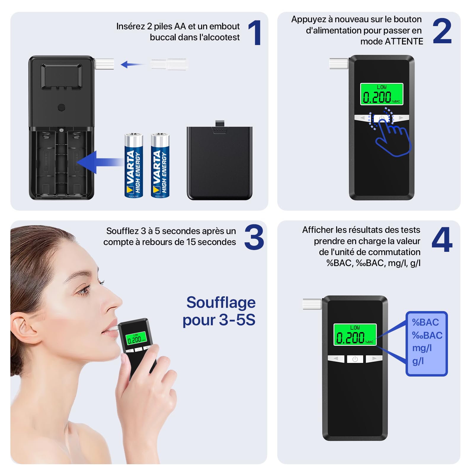 Insérez trois piles AAA (non fournies) et appuyez sur le bouton pendant deux secondes pour allumer l'appareil. Détection Rapide & Résultats Précis: Cet ethylotest électronique maison adopte un capteur semi-conducteur haute précision pour mesurer rapidement et avec précision le taux d'alcoolémie (BAC), avec une précision au trois décimales Que vous buviez de la bière, du vin ou d'autres boissons, vous obtiendrez des résultats fiables instantanément. ✔️【Unités de mesure commutables】L'Alcootest Ethylotest Electronique prend en charge trois unités de mesure (g/100 ml, % d'alcoolémie, g/l). ✔️【Facile à utiliser】L'Alcootest Ethylotest Electronique est facile à utiliser. Cet éthylotest est idéal à la maison, en voyage, au volant, lors de fêtes, mariages, banquets ou autres événements sociaux, pour une conduite sécuritaire après avoir bu. ✔️【Testeur d'alcool de qualité policière】L'Alcootest Ethylotest Electronique est équipé d'un capteur semi-conducteur ultra-sensible pour mesurer rapidement et précisément votre taux d'alcoolémie (TA). Testeur d’Alcool Portable avec 5 Embouts, Éthylotest Electronique... Lors de la première utilisation ou après une période prolongée d'inutilisation, préchauffez l'éthylotest trois fois : allumez-le, attendez qu'il s'éteigne automatiquement, puis répétez l'opération trois fois. éthylomètre électronique Flyhood Éthylomètre Électronique Professionnel Portable - Testeur D'Alcool Avec Écran LED Et 16 Embouchoires Accessoire Voiture éthylotest électronique Homologué Nf Rechargeable 10 Embouts Éthylomètre Électronique NF Homologué - Alcootest Professionnel Avec 10 Embouts - Écran LCD - Rechargeable USB-C - Pour Usage Personnel Éthylomètre Prix Convient à toutes les occasions L'Alcootest Ethylotest Electronique est livré avec 20 embouts buccaux réutilisables, lavables et réutilisables. Soufflez ensuite dans l'appareil pour prendre la mesure. Unités de mesure commutables L'Alcootest Ethylotest Electronique prend en charge trois unités de mesure (g/100 ml, % d'alcoolémie, g/l). Double-cliquez sur le bouton pour passer d'une unité à l'autre selon vos besoins. Facile à utiliser L'Alcootest Ethylotest Electronique est facile à utiliser.