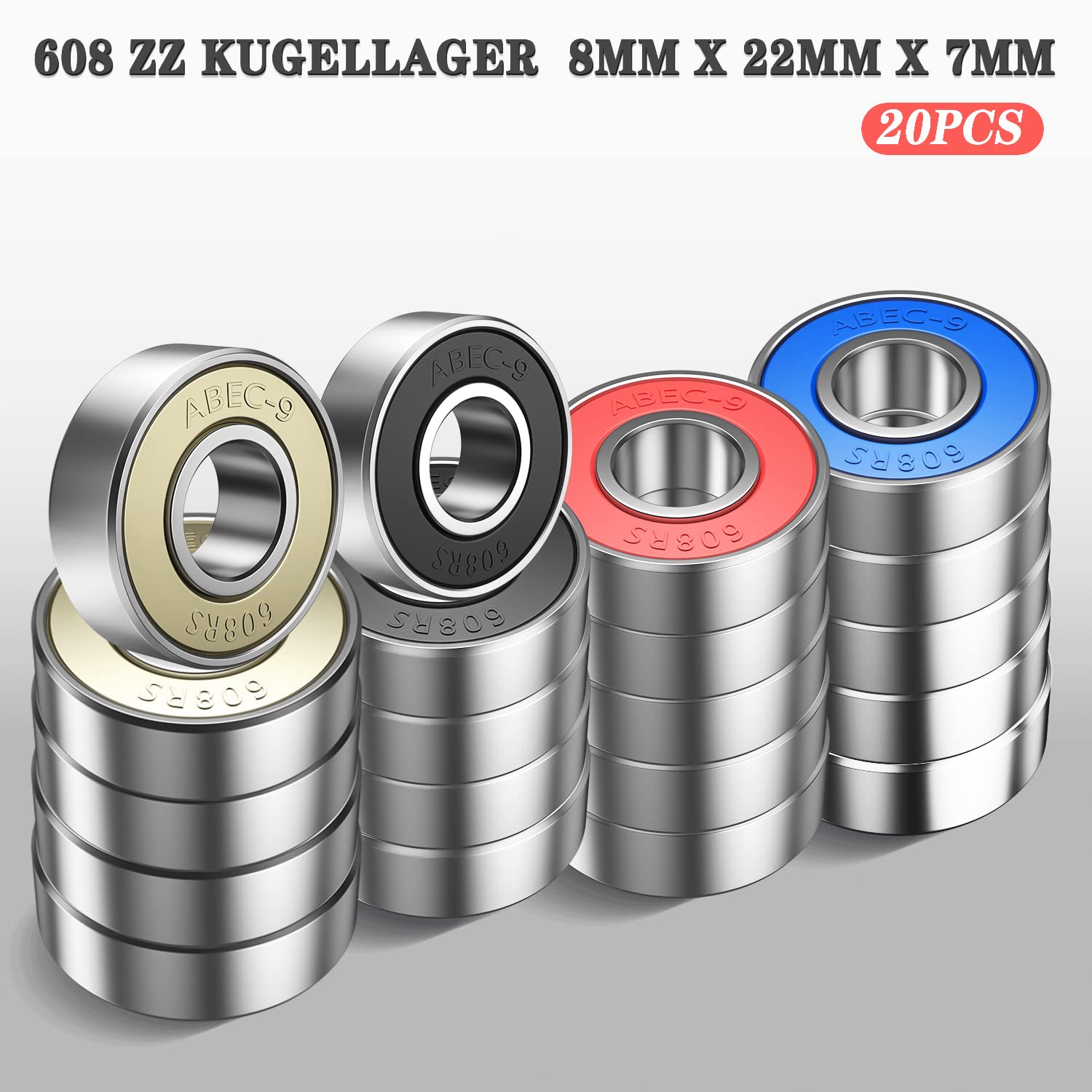Remarque : Les mesures sont prises à la main, les tailles indiquées peuvent donc varier légèrement. Caractéristiques : Matériaux : acier au carbone., Couleur : bleu., Poids : 80 g. TOP 10 des roulements pour skateboard Ambideluxe Roulements ABEC 7 - Speed Bearings 8X 608 ZZ – Roulements à Billes de qualité pour Roulements de skateboard : lot de 8 roulements 608 ZZ dont le diamètre intérieur est de 8 mm, le diamètre extérieur est de 22 mm, la largeur totale est de 7 mm. De qualité supérieure ; pré-lubrifiés avec de la graisse de silicone, ils sont fantastiques pour le patinage à haute vitesse et une performance supérieure Convient pour les scooters, skateboards, longboards, patins à roulettes, etc. Durable et moins de friction : les roulements de longboard sont fabriqués en acier à roulement, durable, résistant à la déformation sous de lourdes charges avec un faible bruit et moins de friction Roulements 608 8mm Intérieur 22mm Extérieur Roulement à Billes 608 - 8 Mm, 1re Qualité NTN 608LLU/2A Roulements Roller Double Blindage Contenu : 8 roulements pour skateboard. Blindage des deux côtés du roulement pour garder le lubrifiant et les contaminants à l'extérieur ainsi que pour un nettoyage facile. Remarque : si vous l'utilisez pour le roulement principal du jouet, veuillez vous assurer que la taille du roulement est 608 et nettoyez l'huile des roulements ; l'huile peut antirouille et prolonger la durée de vie, mais réduira la vitesse.