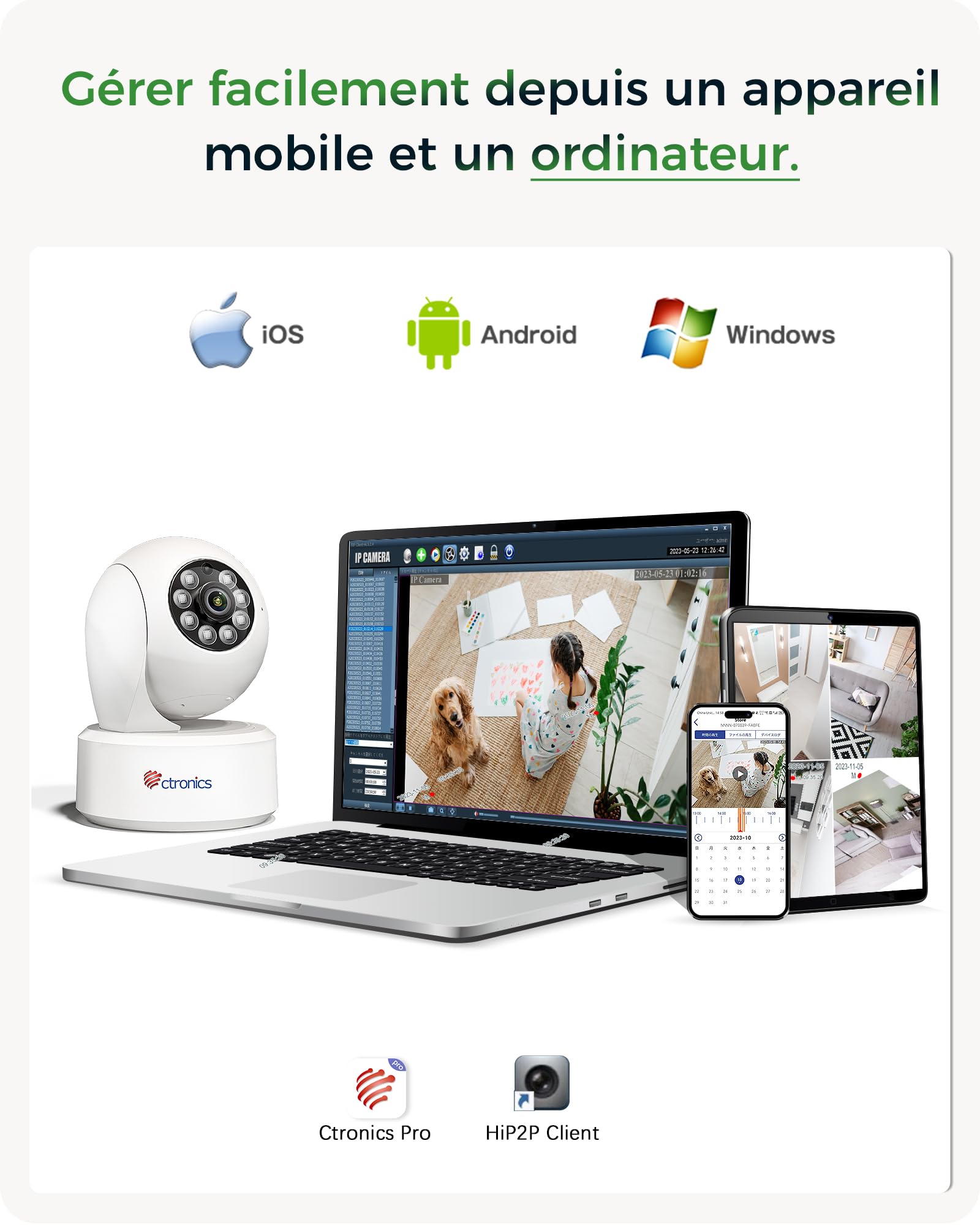 Avec le suivi intelligent des mouvements et la détection des personnes et des animaux domestiques, la caméra n'échappe pas à une activité importante. Ctronics Caméra Surveillance WiFi, 1080P IP Caméra de Surveillance Ext Le stockage flexible se fait au choix via le cloud, la carte TF de 256 Go, FTP, NVR ou NAS. Parfaitement adaptée pour la surveillance des pièces à vivre, des bureaux ou des magasins. S'adapte à diverses configurations de pièces. Ezviz Camera Interieur Ctronics 2K 3MP Caméra Surveillance WiFi Intérieur, 360° PTZ Caméra, IP Caméra Avec Détection Détection IA Personne Et Animal La fonction PTZ à 360 ° permet une surveillance complète sans faille, contrôlable par smartphone ou ordinateur. Recevez des notifications immédiates pour toute activité inhabituelle, assurant une sécurité complète à domicile. Couverture Panoramique à 360° avec Réglage Flexible Profitez d'une couverture complète de la pièce avec une inclinaison et une rotation de 120° verticales et 355° horizontales, surpassant les ajustements verticaux de 90° des concurrents. La caméra fonctionne de manière fiable 24h/24 et 7j/7 et s'intègre facilement dans les systèmes de sécurité existants. Lot de 2 Caméra Surveillance Ctronics 4K 8MP Extérieure 5X Zoom Optique, Caméra IP WiFi 2,4/5 La résolution 4K cristalline offre des images nettes de jour comme de nuit. La caméra intérieure Ctronics 4K vous permet de surveiller ce qui compte le plus. Profitez des fonctionnalités intelligentes de suivi et de surveillance par IA, capables de détecter les mouvements des humains et des animaux domestiques. Recevez des alertes instantanées dès qu'une activité inhabituelle est détectée