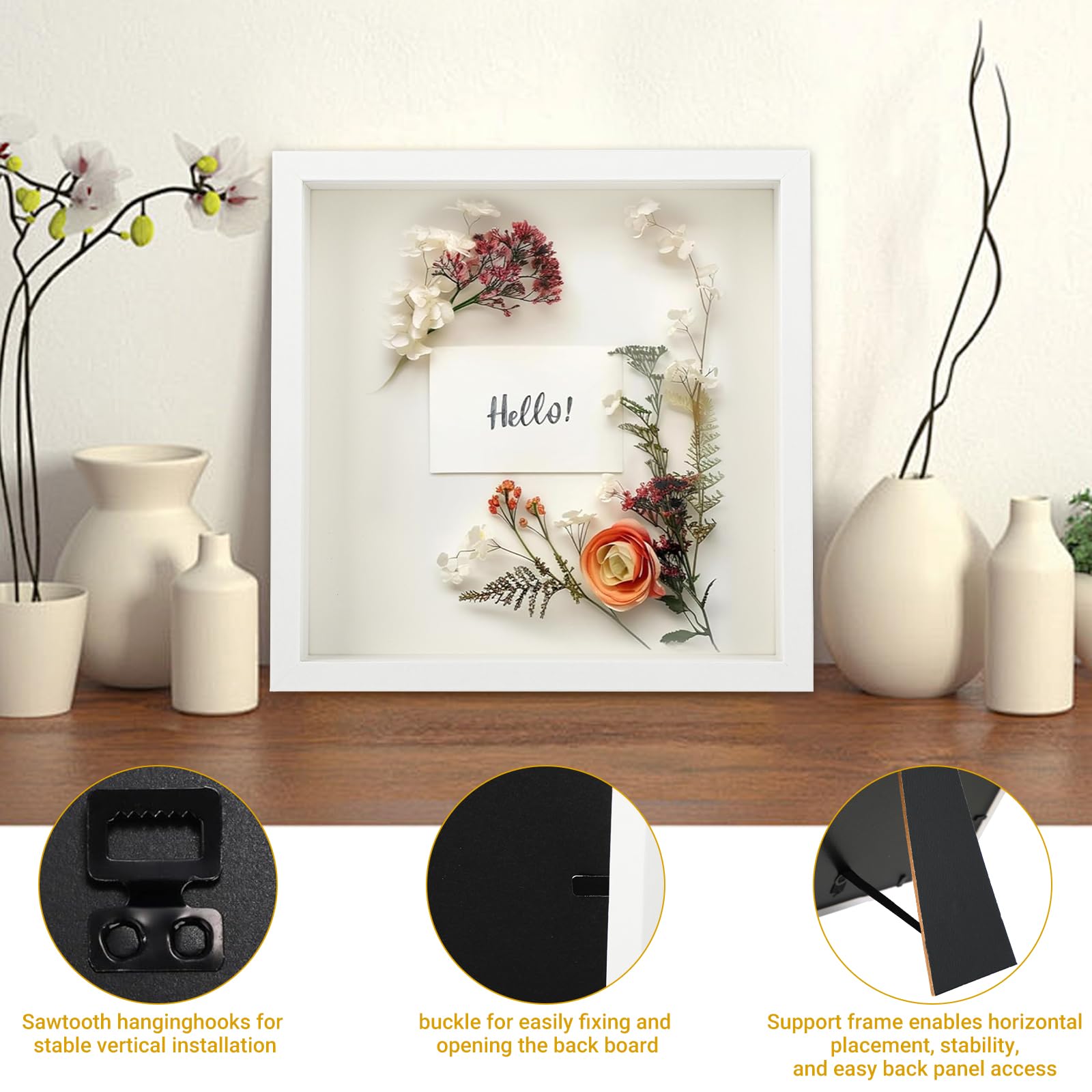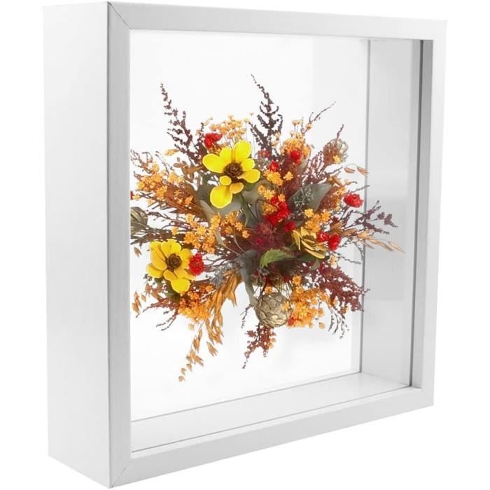 Cadre photo 3D : les dimensions du cadre Shadow Box sont de 22 x 22 x 4,5 cm. Avec des dimensions pratiques de 22 x 22 x 4,5 cm à l’extérieur et un intérieur de 20 x 20 cm, ce cadre profond est parfait pour exposer photos, souvenirs et objets de collection Les dimensions du verre sont de 18,8 x 18,8 cm, avec une profondeur intérieure de 3 cm. Vous pouvez y placer vos photos préférées, des fleurs séchées, des tampons, des guirlandes lumineuses, des coquillages et d'autres éléments pour créer un cadeau spécial pour vos proches. Vous pouvez le remplir à votre guise avec des souvenirs, des photos, des petits cadeaux ou des objets décoratifs et créer ainsi une œuvre d'art décorative unique. Souvenirs Fleurs Séchées Mariage Cadre Photo 3D 27 X 22 Cm Cadre Photo Profond En Bois À Remplir 3D Avec Vitre En Verre Pour Cadre 3d Souvenirs Fleurs Séchées Réalisez vos projets de bricolage et créez de beaux souvenirs. Le cadre en bois à remplir est idéal pour les mariages, les anniversaires, les pendaisons de crémaillère, les anniversaires de mariage, Noël, la Saint-Valentin et diverses autres fêtes. Le cadeau parfait : si vous souhaitez offrir un cadeau à quelqu'un, un cadre photo souvenir est le meilleur choix. Qualité garantie : le cadre est fabriqué en composite de bois (MDF) de haute qualité avec du plexiglas (acrylique), qui est durable et ne laisse pas de traces de doigts. Nos 5 Meilleures Cadre Vitrine Profond en France - Octobre Placez le cadre photo sur la table, le cadre de support assure la stabilité lors d'une installation à l'horizontale. Cadre photo de haute qualité] Le cadre photo 3D de 20 x 20 cm est fabriqué en bois MDF de haute qualité avec une finition exquise, des bords lisses, solide et durable et difficile à déformer et à fissurer