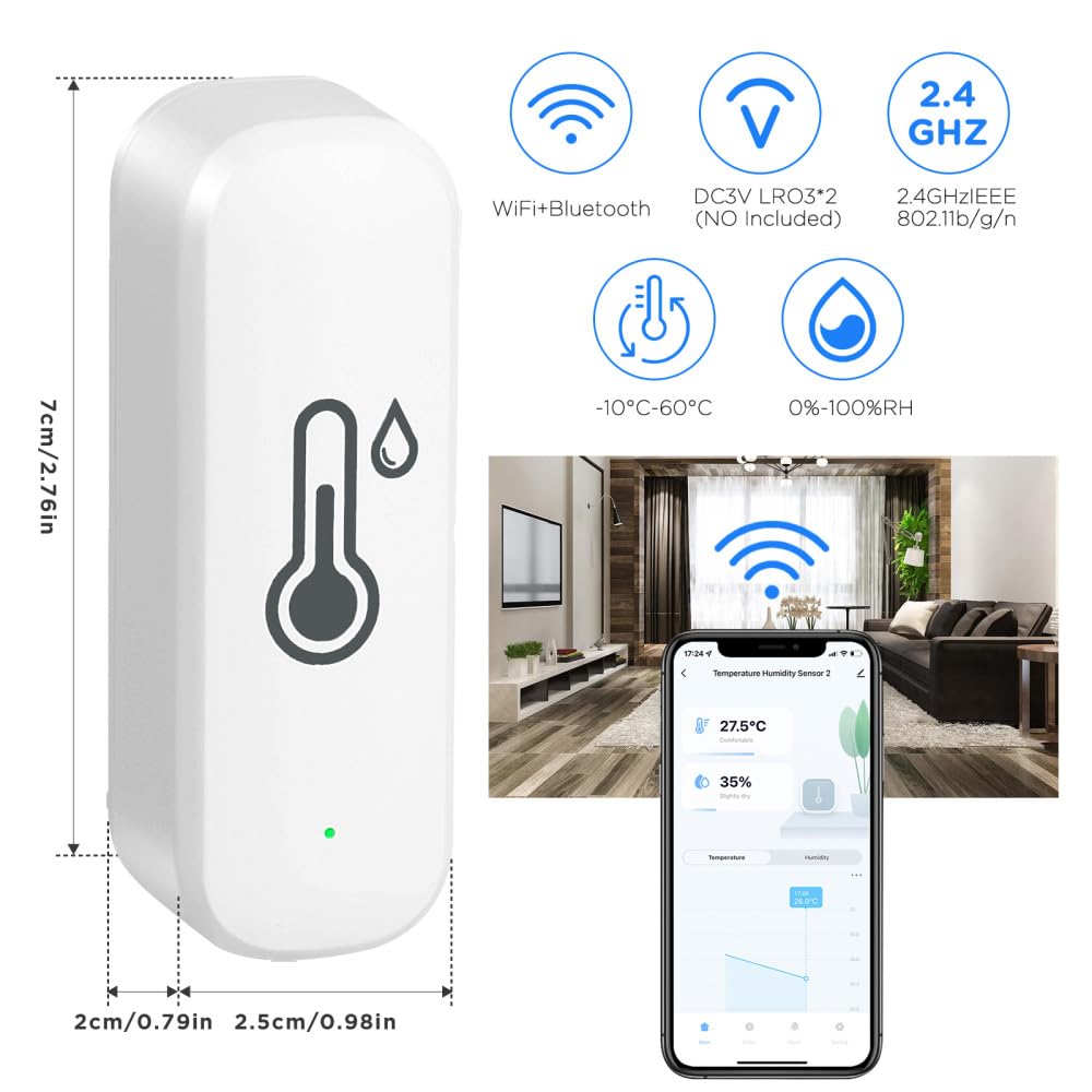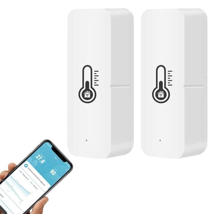 Précision de la température : ± 0,3., Plage d'humidité : 10 % à 99 % d'humidité relative. C'est le choix idéal pour la maison intelligente, la garde des mères et des enfants et la gestion des entrepôts., 3., Le capteur de température et d'humidité Bluetooth WiFi est spécialement conçu pour les environnements domestiques intelligents. Dimensions : 70 x 20 x 25 mm Alimentation : AAA 1,5 V x 2 (piles non incluses). 【Enregistrement et exportation de données】Le capteur de température intérieure et d'humidité sans fil peut enregistrer la tendance de la courbe de température et d'humidité et vous aider à comprendre clairement les changements de température et d'humidité. Caractéristiques du produit : Nom du produit : détecteur de température et d'humidité WiFi Bluetooth Matériau : ABS., Couleur : blanc. Thermomètre Et Hygromètre WiFi 1 Pièce, Mini Thermomètre Sans Fil Avec Application Smart Tuya Enregistrement Des Donnees Et Alertes De Notification 98725384 【Commande vocale intelligente】: le thermomètre hygromètre WiFi WiFi intérieur est compatible avec Tuya Smart, Smart Life, Amazon Alexa et Google Home, et permet la consultation vocale des informations sur la température et l'humidité. Dès que la température et l'humidité dépassent la plage définie, le thermomètre hygromètre Bluetooth envoie immédiatement un rappel d'alarme via le téléphone portable. WiFi Thermomètre Intérieur Hygromètre, Sans Fil Thermomètre Hygromètre... Capteur Température Humidité Intelligent CEIEVER Thermomètre Hygromètre Sans Fil WiFi Thermomètre Hygromètre Application Notification Et Stockage De Données Bluetooth Fonctionne Avec Hygromètre Wifi Prise en charge Wi-Fi : 2,4 G IEEE 802., 11 b/g/n. Il dispose d'une fonction de mesure de haute précision et peut détecter la plage de température de -10 °C à 55 °C et la plage d'humidité de 10 % à 99 % d'humidité relative en temps réel. Affichage de la température et de l'humidité à distance : le capteur de température et d'humidité peut être affiché à distance. Avec cet article, vous pouvez surveiller la chambre, la cave à vin et le garage de votre bébé Il est précis et fiable. Liste des produits : 2 capteurs de thermomètre hygromètre WiFi., Capteur de thermomètre WiFi : thermomètre sans fil WiFi, hygromètre, capteur d'humidité Wi-Fi, capteur de température avec enregistrement de données et alarme de notification et travail avec l'application Smart Tuya 1., Le mini thermomètre et hygromètre est petit et peut être facilement placé dans les plantes en pot, les bacs à reptiles ou d'autres petits espaces. Le mini thermomètre hygromètre prend en charge la fonction d'enregistrement des données à long terme et les données sont exportées au format CSV, ce qui vous permet de visualiser les tendances historiques à tout moment.