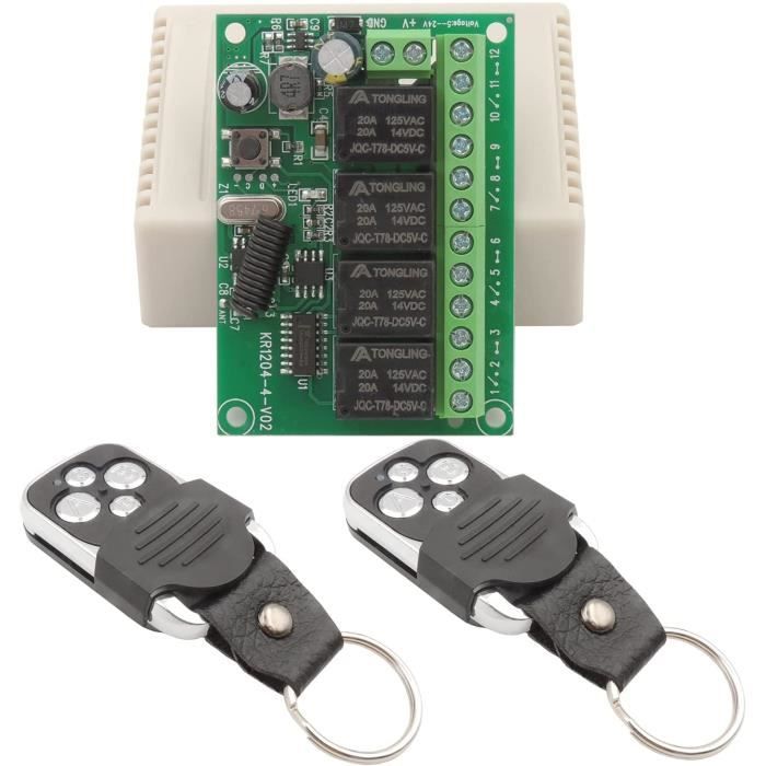Mode d'adaptation : bouton d'apprentissage Large gamme d'utilisations : de la simple télécommande domestique jusqu'au contrôle autonome comme les fenêtres, l'entrée, les portes de garage, le système d'alarme, l'équipement de levage et ainsi de suite Courant de veille : 5MA Fonction de réinitialisation : Efface toutes les télécommandes correspondantes. L'application de la télécommande rend la transition vers l'automatisation complète de vos appareils domestiques plus pratique et plus rapide. 【4 canaux pour plus de contrôle】 Mode de travail réglable, contrôle de l'appareil de tournage/recul, o n/off. La LED du récepteur clignote puis s'éteint. Le mode de verrouillage est réglé avec succès. Réinitialisation des paramètres : Après avoir appuyé 8 fois sur le bouton d'apprentissage du récepteur, le récepteur efface toutes les données de la télécommande dans sa mémoire. Sonew Kit Récepteur Transmetteur RF 4CH 433MHz Universel pour Interrupteur à Relais Sans Fil... Interrupteur autobloquant, Jog, Inter-lock. Le Mode momentané est réglé avec succès. code d'apprentissage à haute sécurité, faible taux de répétition et modèle de répétition, effacement du code et réapprentissage à tout moment. Le Mode bascule est réglé avec succès. Température de fonctionnement : -10 ~ +80 Sortie : NO , NC , COM 4 télécommandes (piles incluses) Mode momentané Étape 1) Appuyez une fois sur le bouton d'apprentissage du récepteur. Plusieurs télécommandes peuvent être ajoutées pour un contrôle partagé Performance stable et fiable, haute sensibilité de réception. Les produits peuvent être utilisés dans les maisons, les fermes, les usines, les bureaux, les laboratoires, les supermarchés, etc. le voyant clignote puis s'allume. Sensibilité du récepteur : -104dBM QIACHIP Commutateur à Distance Sans Fil, DC 12V 433mhz Relais rf 4ch,Interrupteu Puissance de charge : 120W×4 Paramètres du produit DC 6V-30V 4CH KR1204B Fréquence RF : 433., 92MHZ Le nombre maximum de télécommandes à appairer est de 20 pièces. Il y a 3 terminaux (normalement ouvert, commun, normalement fermé) pour chaque relais. Lorsque la LED du récepteur clignote, la fonction de réinitialisation est terminée. Mode de modulation : ASK QIACHIP est une entreprise de produits de contrôle sans fil RF et de produits de soutien IOT pour la maison intelligente, spécialisée dans les interrupteurs de contrôle à distance RF et les interrupteurs intelligents WIFI/Zigbee/Bluetooth. Mode latché Étape 1) Appuyez 3 fois sur le bouton d'apprentissage du récepteur. Le paquet comprend 1x Récepteur relais RF 1x Manuel du produit Radio Commande QIACHIP Commutateur De Télécommande DC 12V 24V 4CH 433Mhz RF Module Récepteur De Relais Sans Fil Avec 4 émetteurs, Pour Coffre De Camion, Moteur, Garage, Serrure électrique Télécommande Universelle Réinitialisation des paramètres et fonction de réinitialisation Remarque : tous les modes de fonctionnement suivants doivent être mis en œuvre avec une télécommande (émetteur) et un contrôleur (récepteur / commutateur de télécommande sans fil) de marque QIACHIP.