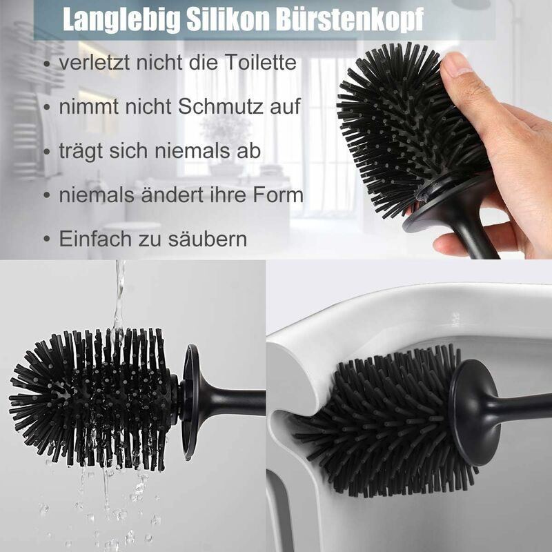 Brosse WC en silicone flexible, ingénieuse, pratique, hygiénique, desi - La maison rangée Manche Inox Socle Anti-éclaboussures Balai Toilette Hygiénique Brosse WC Silicone SAVEGA Avec Réservoir - Design Hygiénique Anti-éclaboussures - Noir - Facile à Nettoyer Brosse Toilette Antibactérienne Silicone Nettoyage Facile Balai Toilette Wc Gain de Place Élégant:Avec son design autoportant épuré, ce set compact s'intègre à toutes les décorations de salle de bain modernes. Nettoyage efficace à 360° : Contrairement aux têtes de brosse plates ordinaires, la tête de brosse en silicone est agrandie et élargie, le point de contact souple pénètre profondément dans le rebord de la cuvette des toilettes et dans le coin mort du rebord inférieur pour éliminer complètement les taches ; par rapport aux poils durs traditionnels, il n'abîme pas le glaçage et nettoie plus efficacement. Plus durables que les ensembles en plastique traditionnels, ils garantissent une longévité accrue. Brosse WC Silicone Flexible - Décorations Toilettes Socle amovible : le socle à double couche est facile à retirer et à nettoyer. Brosse WC avec Support - Brosse WC en Silicone - Ensemble WC - Noir... Le bord intérieur surélevé empêche les éclaboussures d'eau sale et garantit un sol propre et net. Durabilité et longévité:Le manche et la base de la brosse à toilettes sont fabriqués en acier inoxydable, ce qui garantit leur stabilité dans les environnements humides, sans déformation.
