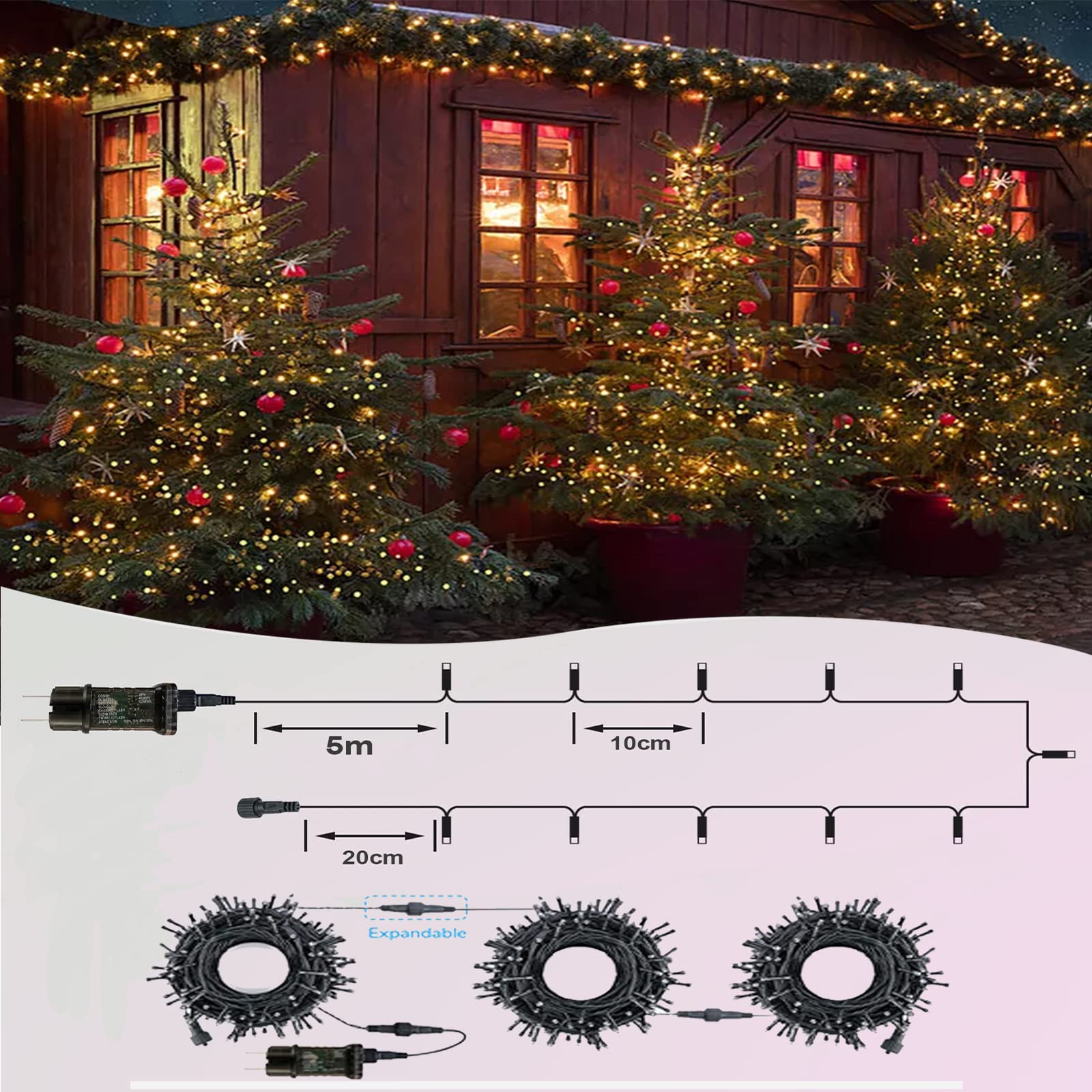 CADEAU DE NOËL PARFAIT 1 3600mAh Rechargeable 2 Deux Modes de Contrôle VS Alimenté Par Prise Que ce soit pour Noël, Halloween, un mariage, un anniversaire ou simplement pour éclairer une chambre, une fenêtre ou un balcon, cette guirlande lumineuse LED pour sapin de Noël crée une atmosphère charmante et élégante en toute occasion grâce à sa lumière blanche et chaude. 【Étanchéité IP44 - Conçue pour Une Utilisation en Extérieur】Avec un indice de protection IP44, la guirlande lumineuse et le compartiment à piles sont protégés contre les éclaboussures. Guirlande Télécommande 8 Modes Guirlande Lumineuse Exterieure Pile Rechargeable, 10M 100 LED Assise Balancelle Intérieur Extérieur Que vous vous détendiez à la maison ou décoriez votre extérieur, le système de double contrôle garantit une flexibilité et une facilité d'utilisation maximales, même à distance. Fiable et résistante aux intempéries, elle est idéale en toute saison. Guirlande Lumineuse d'extérieur Multifonction La minuterie intégrée (3/5/8 heures) allume et éteint automatiquement la guirlande lumineuse quotidiennement. Guirlande 1000 led blanc chaud Guirlande Lumineuse Rechargeable Améliorée 1 Pour Noël 2 Déco Extérieure 3 Déco Intérieure 【8 Modes d'éclairage, Minuterie et Fonction Mémoire】Avec 8 modes d'éclairage différents, dont lumière fixe, clignotante ou douce, créez l'ambiance idéale à tout moment. VS Alimenté par Piles Guirlande lumineuse extérieure 100 LED, 10 m, à piles, avec télécommande et minuterie intérieure, idéale pour terrasse, Pâques, Noël et fêtes (multicolore). EN STOCK : Guirlande extérieure à piles pas cher. Grand choix, promos permanentes et livraison rapide partout en France. Paiement sécurisé Guirlande LED 10M, dimmable, télécommande, extérieur, blanc froid 【Guirlande Lumineuse Alimentée par Batterie Rechargeable】Équipée d'une puissante batterie de 3600 mAh, cette guirlande lumineuse d'extérieur offre jusqu'à 30 heures d'autonomie avec seulement 8 heures de charge.