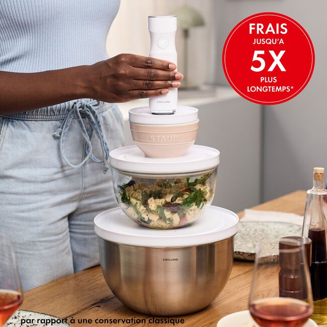 Kit de démarrage sous vide - 7 pièces - Zwilling Fresh & Save – GAMECA RIXHEIM Et pour aller plus loin, les sacs sous vide FRESH & SAVE complètent l’ensemble : idéals pour congeler, cuire sous vide ou mariner avec précision. Zwilling Sous Vide Verre Zwilling - Fresh And Save - Boîte Sous Vide 2L - Verre Borosilicate Poele Zwilling Faites rimer fraîcheur et simplicité : ces deux bols en verre vous permettent de préparer, servir puis conserver vos plats sans transvaser. FRAÎCHEUR POLYVALENTE : le kit de démarrage ZWILLING FRESH & SAVE BOWLS comprend 2 bols en verre polyvalents (18 et 24 cm de diamètre) pour préparer, cuire, servir et conserver, ainsi que des couvercles sous vide assortis dotés de la technologie Double Sealing. PLUS DE FRAÎCHEUR : les couvercles sous vide conservent vos aliments jusqu'à 5 fois plus longtemps que les méthodes de conservation traditionnelles sans vide. Une fois que vous serez équipé avec ce set de démarrage dans votre cuisine, vous ne pourrez plus vous en passer. Les deux grands récipients sous vide design en verre, les quatre sacs sous vide réutilisables ainsi que la pompe sous vide automatique et très pratique changent la donne dans une cuisine moderne Pompe à vide « FRESH & SAVE » - Zwilling Vos aliments restent ainsi jusqu’à cinq fois plus longtemps frais qu’avec une conservation classique (par rapport à un stockage sans mise sous vide). Une solution modulaire, élégante et anti-gaspi, signée ZWILLING. Parfaits pour le meal prep comme pour les restes, ils s’intègrent naturellement dans votre routine quotidienne.