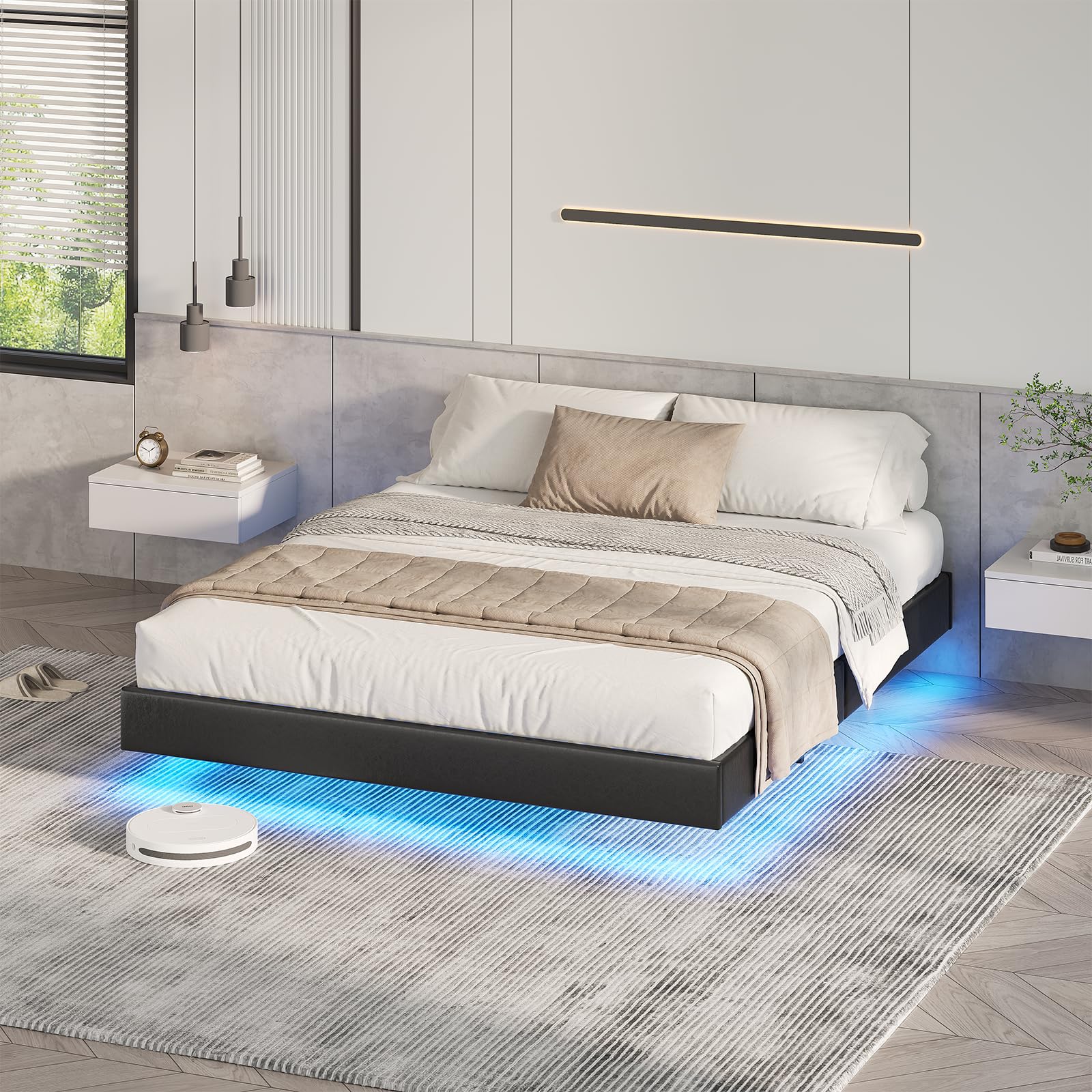 Remarque : Les dimensions du produit sont mesurées manuellement et peuvent varier de 1 à 2 cm. Aucun outil électrique n’est requis pour l’installation. Des panneaux de fibres écologiques de qualité supérieure et des patins en caoutchouc silencieux assurent un sommeil parfaitement silencieux, pour un sommeil réparateur et profond. 【Rangement pratique et chargement USB】 La tête de lit rembourrée est dotée d'un compartiment de rangement rabattable intégré pour ranger facilement les lectures du soir et les essentiels du quotidien. Ses lignes épurées et sa hauteur sous plafond élevée se complètent harmonieusement, insufflant une forte touche d'art moderne à la chambre. La tête de lit rembourrée et inclinée offre un grand confort pour s’appuyer, idéal pour des soirées détendues au lit. Votre lit semble flotter au-dessus du sol ! Le design unique avec des pieds dissimulés confère à ce cadre de lit un aspect moderne et high-tech, créant une légèreté onirique Lit Coffre 140 X 190 Cm - Tissu Bouclette - Gris Clair - DAMADO De Pascal Morabito 92728289 Un rembourrage haute résilience enveloppe le lit, le protégeant des chocs et des vibrations, tout en absorbant les vibrations dues aux mouvements du corps. De l'installation au nettoyage, nous vous offrons une expérience utilisateur optimisée. 【Installation et nettoyage faciles】Tous les panneaux et accessoires sont pré-étiquetés et assemblés par une seule personne en moins de 30 minutes, avec des instructions illustrées claires. L'éclairage et la musique intégrés créent une ambiance audiovisuelle personnalisée, transformant chaque nuit en un rituel de sommeil. Brinlawb : Lit Beige 140x190cm, Lit 2 Personnes avec des lumières LED, Cadre de Lit 140 x 190 avec sommier à Lattes en Bois et Structure en métal, Lit Double, Facile à Assembler, sans tête de lit, Beige Charge et rangement : Équipé de 3 ports USB et d'un port Type-C avec fonction de charge rapide 20W, ce lit vous permet de recharger vos appareils facilement. Une étagère intégrée à la tête de lit offre un espace pratique pour vos petits objets Qu'il soit minimaliste ou luxueux, il s'intègre parfaitement à tous les espaces et devient un point focal, renforçant l'impression générale de luxe et de design. De plus, de petites poches de chaque côté de la tête de lit permettent de ranger téléphones, clés, etc., 3., Éclairage d'ambiance : Une bande lumineuse sous le lit ajoute une touche futuriste et technologique, tout en offrant une douce lumière nocturne pour un sommeil confortable., 4., Texture haut de gamme et design minimaliste : Le similicuir souple, associé à des formes épurées et linéaires, crée un style moderne, élégant et chaleureux qui s'intègre parfaitement à une variété de styles d'intérieur., 5., Confort polyvalent : Le dossier moelleux de la tête de lit permet de se détendre ou de lire pendant de longues périodes, alliant fonctionnalité et confort., 6., Disponible en trois tailles (140 x 190 cm/140 x 200 cm/160 x 200 cm). De la lumière jaune chaude pour une lecture agréable aux rythmes vibrants pour des expériences audiovisuelles immersives, tout se contrôle facilement d'un simple clic. 1., Design flottant : Les pieds de lit dissimulés et flottants offrent non seulement une expérience visuelle agréable, mais préviennent également les chocs., 2., Design table de chevet : La tête de lit est dotée d'un rabat dissimulé astucieux, offrant deux espaces de rangement supplémentaires pour les petits objets, rendant le rangement plus discret et pratique. 【Effet visuel flottant】 Le lit double est doté d'une structure innovante à pieds dissimulés, rompant avec la lourdeur des meubles traditionnels et créant un effet visuel léger et flottant. Le lit est fabriqué en similicuir résistant et imperméable, facile à nettoyer, même en cas de déversement.