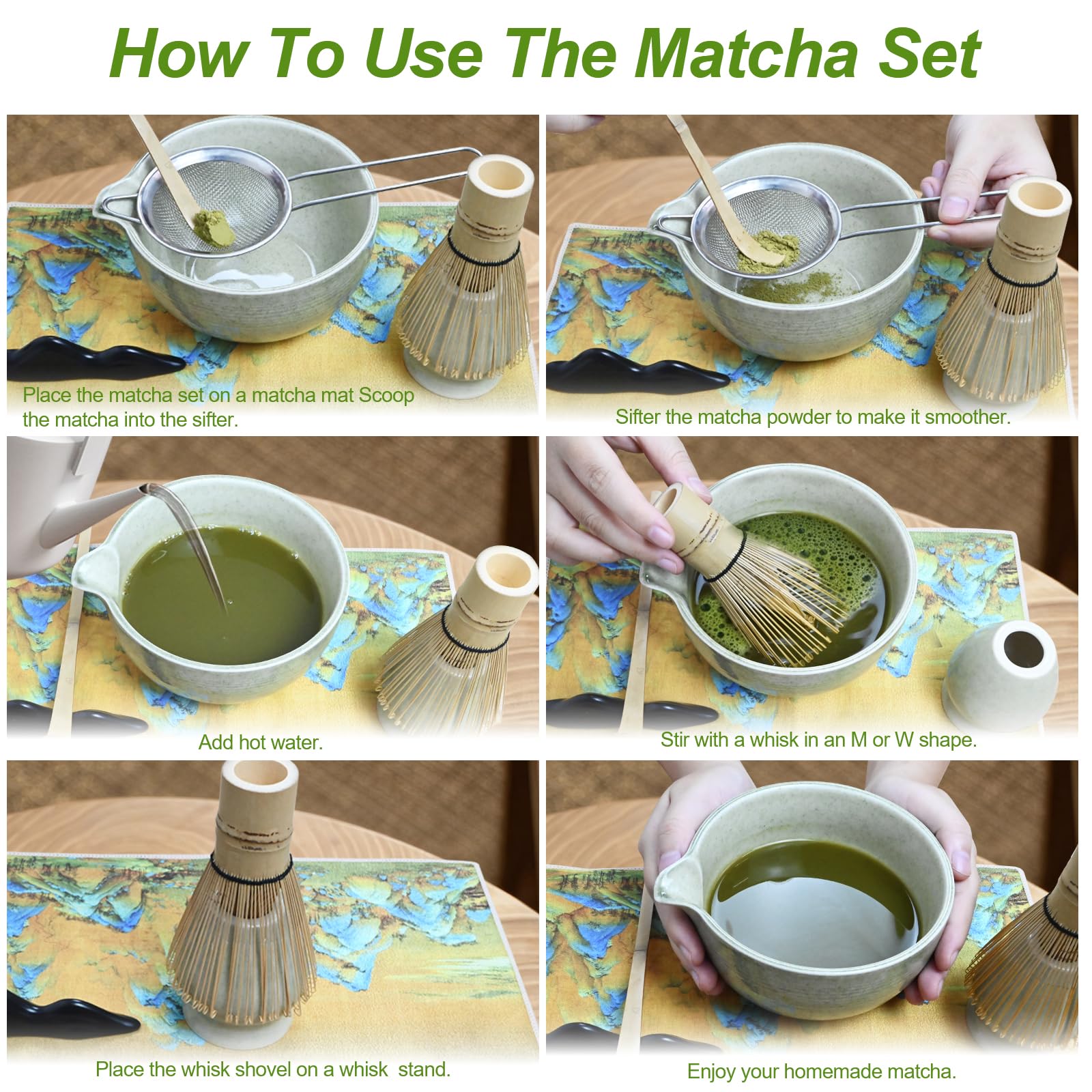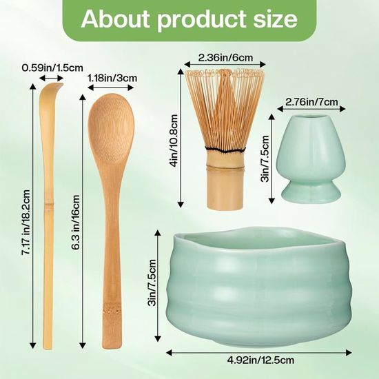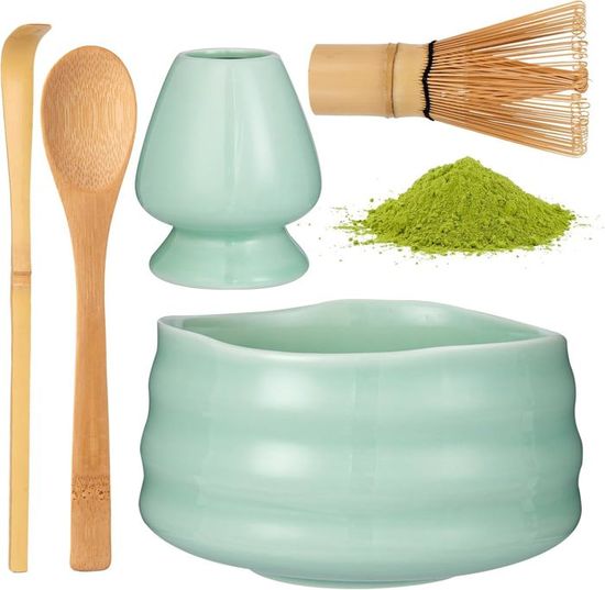 Le bol à matcha est fabriqué à partir de matériaux de qualité alimentaire, vous n'avez donc pas à vous soucier de la présence de substances nocives dans la boisson. Que vous soyez novice ou amateur expérimenté, ce set contient tout ce dont vous avez besoin pour préparer des lattes au matcha onctueux,des thés traditionnels légers ou des boissons glacées au matcha, sans aucun accessoire supplémentaire. 【🍵 Set japonais pour matcha 7 pièces】 Ce set pour matcha comprend 1 * fouet à matcha, 1 * cuillère à matcha, 1 * bol à matcha 930 ml, 1 * support en céramique pour fouet à matcha, 1 * support en céramique pour cuillère, 1 * serviette à thé, 1 * tamis à matcha. Le bol à matcha peut être utilisé pour mélanger du chocolat chaud, le tamis à thé pour saupoudrer des desserts de sucre en poudre et le fouet à matcha pour faire mousser le lait dans le café. Le set comprend : 1 bol à matcha (930 ml), 1 fouet à matcha, 1 cuillère à thé en bambou, 1 support pour fouet à matcha, 1 support pour cuillère à thé en céramique, 1 torchon en coton et 1 tamis à poudre de matcha. Kit Matcha Complet 7 Pièces en Bambou et Céramique - Fouet 【🍵 Design élégant et pratique 】 Les couleurs douces du set à matcha ajoutent une touche d'élégance à votre comptoir de cuisine ou à votre bureau. Le bol en céramique est doté d'un bec verseur intégré pour verser sans renverser. Service à thé japonais Matcha (3 pièces)-cuillère ... – Grandado Kit Matcha Japonais Matcha Kit - 7 Pièces Kit Matcha Complet Ensemble Fouet En Bambo Bol Cuillere A The Porte Fouettorchon Porte Cuillere A The Ideal Pour La Maison Le Bureau Et Comme Cadeau Vert 91815101 Cadeau Thé Matcha Fouet Tamis C'est le choix idéal pour les amateurs de la culture de Kyoto et du matcha. Remarques : trempez le fouet à matcha dans de l'eau chaude avant utilisation. Test du kit matcha Ritual : ensemble fouet et bol à matcha Après utilisation, rangez le fouet à matcha dans son support afin qu'il conserve sa forme parfaite. Il est épais et résistant aux rayures. Quand tradition rime avec mode – enrichissez votre rituel quotidien du matcha Avec ce set de 7 pièces, il ne s'agit pas seulement de préparer du matcha. Ce set polyvalent répondra à tous vos besoins en matière de boissons.