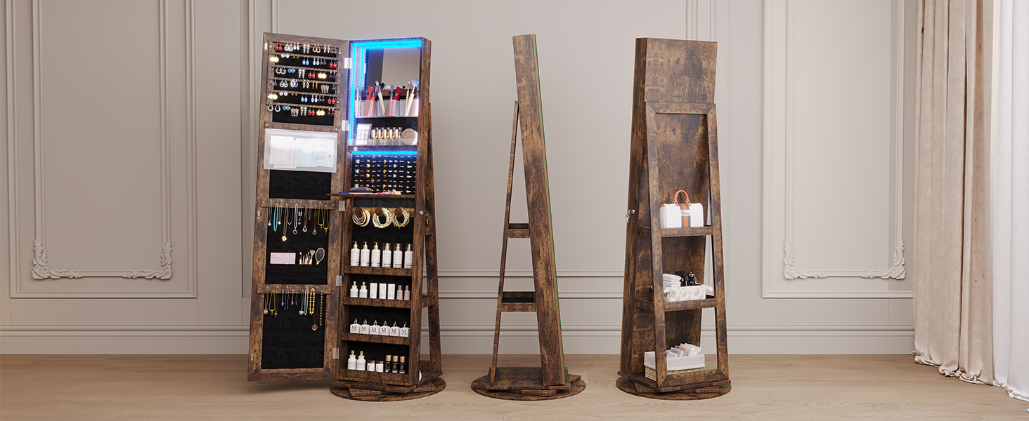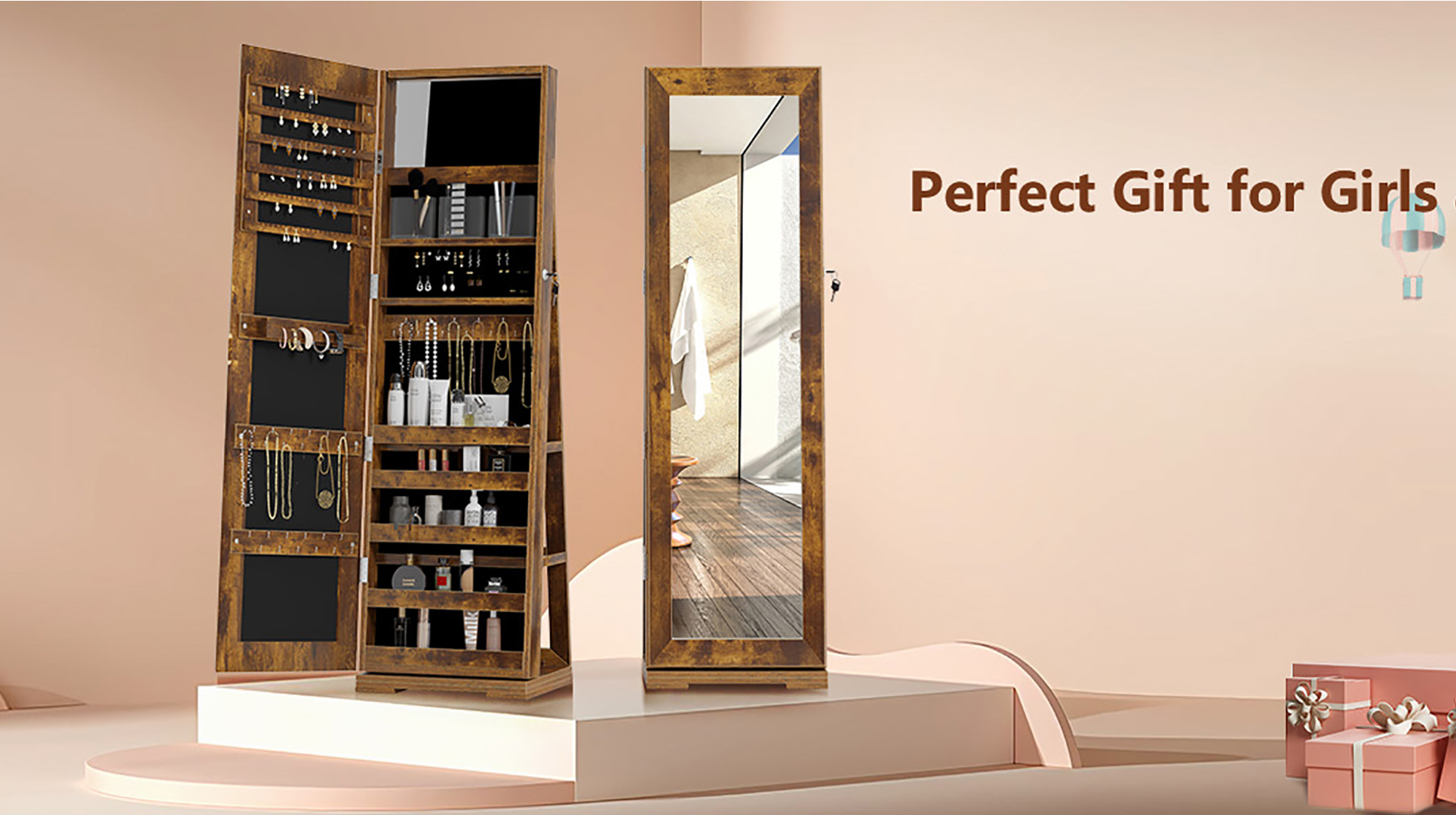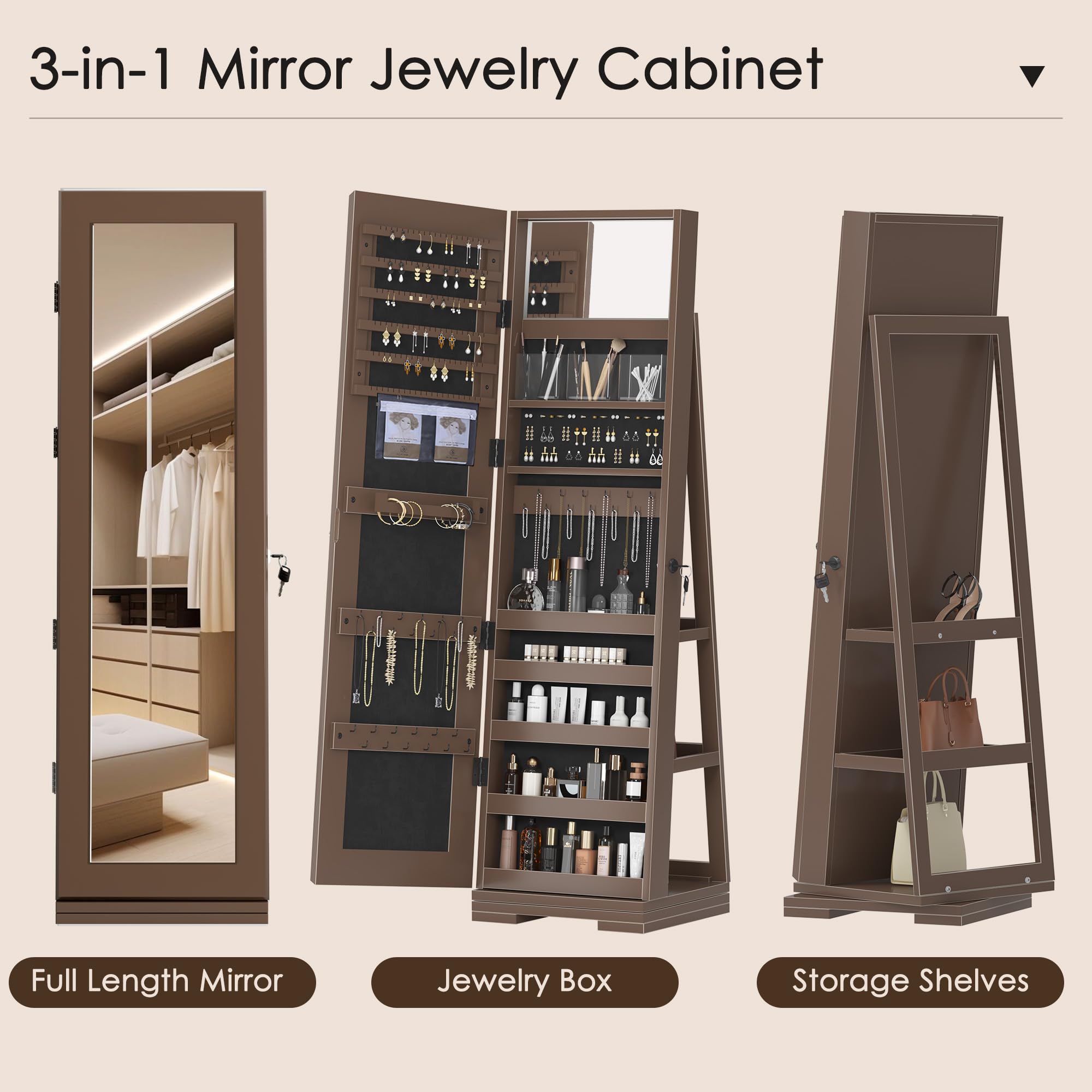 COSTWAY Armoire à Bijoux Pivotante à 360°, Miroir Autoportant Pleine Longueur Avec Rangement Pour Bijoux Etageres Porte Manteau Lumieres Led 3 Couleurs Organiseur De Bijoux Rotatif Blanc 77745777 Miroir Sur Pied Armoire à Bijoux Avec Miroir Pleine Longueur Rotative à 360 Armoire à Bijoux 360 Miroir pleine longueur : miroir parfait de design moderne, visualisez votre image de la tête aux pieds. SDHYL Armoire de rangement à bijoux avec miroir, 360 ° rotatif organisateur de bijoux suspendu, Boîtes à bijoux en bois miroir pleine longueur et organisateurs, Armoire verrouillable de stockage de maquillage de bijoux debout avec serrure Utilisez un doigt pour déplacer le miroir et obtenez les accessoires sur les étagères pour la collocation, puis déplacez le miroir vers l'arrière pour vérifier votre image Armoire à bijoux miroir 3 en 1 : Cette armoire polyvalente combine les trois avantages d'une armoire à bijoux, d'un miroir pleine longueur et d'un support de rangement. L'armoire à bijoux verrouillable stocke vos bijoux dans un espace sûr et privé Miroir debout sur toute la longueur : notre armoire à bijoux (taille : 38,1 x 38,1 x 160 cm) permet aux utilisateurs de voir la tenue clairement et facilement, le miroir en verre de qualité supérieure offre une image réelle et évite l'effet amusant de la maison. Organisateur de bijoux rotatif 360 boîte de rangement de maquillage... Dimensions de l'armoire à bijoux : dimensions totales : 38,1 x 38,1 x 160 cm avec base pivotante, miroir pleine longueur, petit miroir et organisateur de bijoux à l'intérieur, étagères pour sacs derrière. Étagères à base pivotante à 360° derrière : l'armoire à bijoux est parfaite pour placer ou obtenir des accessoires avec l'armoire à bijoux rotative à 360°.