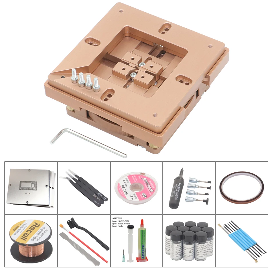 Différentes tailles de billes et autres mailles en acier sont disponibles pour s'adapter à la bille BGA. Elle peut être équipée de mailles en acier de 80 x 80 mm et de 90 x 90 mm, pour des performances élevées et une large gamme d'applications Listing 2 : 1 x pour BGA relist Listing 3 : 10 x templates+ 1 x for BGA relist Pochoirs 0.3mm à 0.76mm Kit De Reballing Table Billes Lourdes BGA 90 Mm Avec 10 Pochoirs Poinçons Soudure BGA Caractéristiques : * * Matériaux : * 90 mm argent pour gabarit de table robuste BGA support de fixation PCB * 10 modèles * Facile à utiliser et polyvalent. Facile à utiliser et polyvalent : ce kit de reballage est facile à utiliser, ce qui le rend adapté pour les professionnels et les amateurs de bricolage. Il peut être utilisé pour une large gamme d'appareils électroniques. Harnais pour souffleur BGA 250 et BGA 160 Rebillage de composant BGA en France Dimensions : 9 x 8 x 3 cm. 【Pour kit de rebondissement】Fabriqué en matériaux, ce kit de reballage est conçu pour être durable. Caractéristiques : Type (facultatif) : 10 modèles, table HT-90, 10 modèles + table HT-90., Matériau : métal., Couleur : argenté.