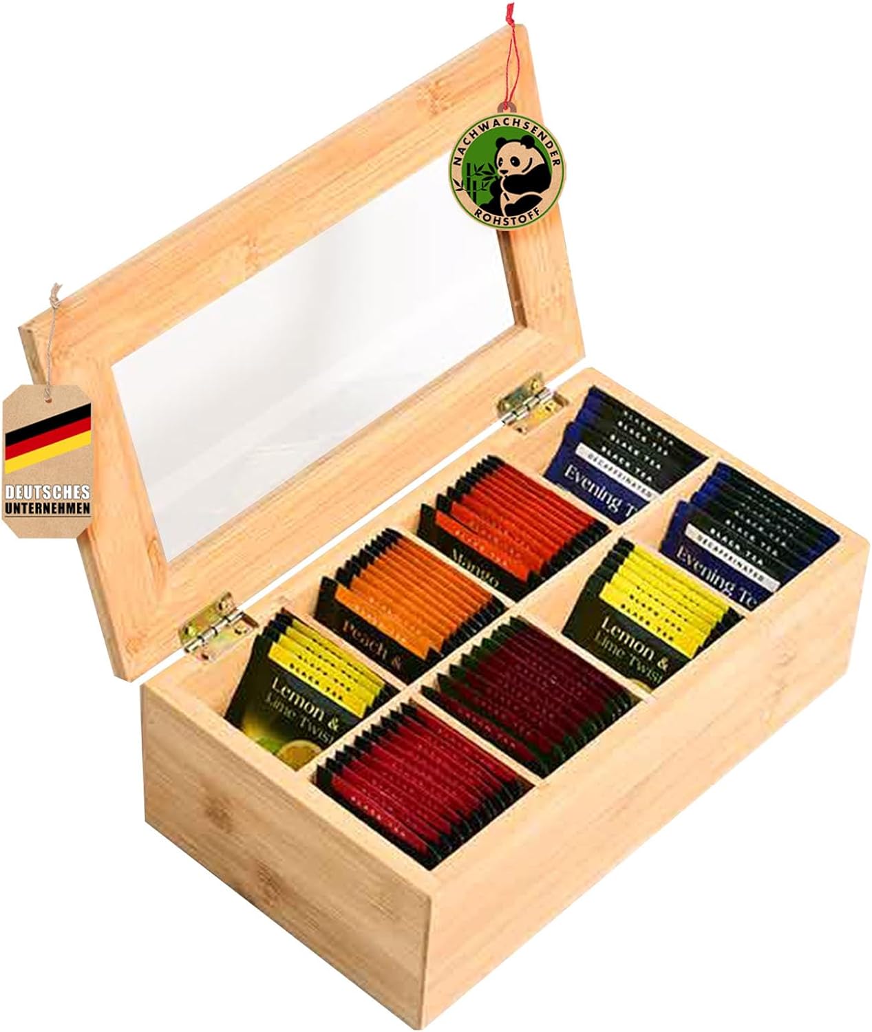 Pleine d'arôme pour un plaisir de thé : grâce à une fermeture magnétique, le couvercle reste bien en place, ouverture et fermeture faciles de la boîte par charnières Boîte à thé classique en bambou durable et à croissance rapide avec de la place pour jusqu'à 64 sachets de thé courants, pour une présentation claire et attrayante des sachets de thé à la maison et sur le buffet Grande fenêtre en verre plastique pour sélectionner facilement la variété de thé souhaitée, tri facile et clair de différents types de thé grâce à une division en 8 compartiments Boite à thé grand modèle | La Norme est ennuyeuse Contenu de la livraison : 1 boîte à thé Westmark Teatime, longueur totale : 31,8 x 19,8 x 6,3 cm, matériau : bambou, couleur : marron clair, 15732260, sans contenu Maison - Découvrez notre offre Teebox 15732260 Teatime Boîte à thé en Bambou 8 Compartiments 28 x 16 [S266]. Livraison gratuite à partir de 25€* | Paiement sécurisé | 4x possible | Retour simple et rapide Boîte Thé Rangement Clair Bambou Westmark 15732260 Teatime - Caja De Té Con 8 Compartimentos Boite A Tisane Vous pouvez stocker vos sachets de thé ou votre thé en vrac ainsi que vos infusions. Elle est munie d'un couvercle transparent pour pouvoir visualiser à tout moment ce qui se trouve dans votre coffret à thé. Elle peut être livrée avec 6 ou 8 compartiments. La boîte est faite en bois de bambou laqué