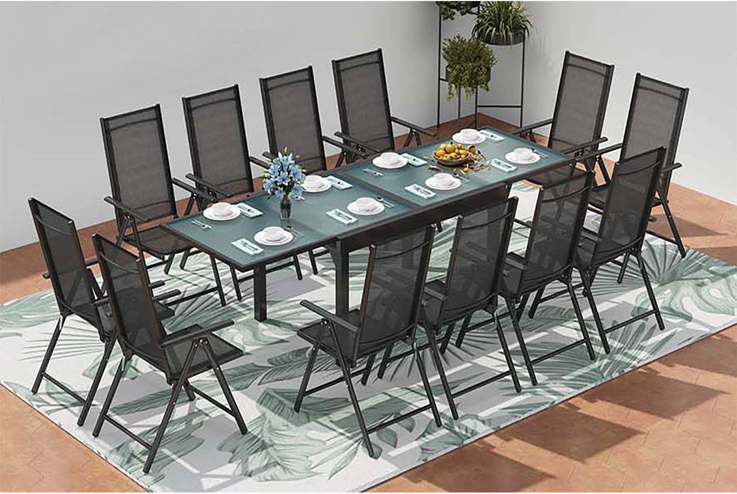 L’assise en polyester gainé de PVC allie confort et résistance aux usages intensifs en extérieur. Hauteur : 72 cm, parfaite pour des repas conviviaux ou des réunions informelles. Chaque invité peut trouver sa position idéale pour manger, discuter ou se détendre. Idéal pour repas familiaux ou réunions professionnelles. Caractéristiques principales : ✓ Table 180 x 90 cm avec plateau en verre poli ✓ 10 chaises pliables & inclinables – confort ajustable ✓ Structure aluminium + toile polyester/PVC résistante ✓ Usage extérieur uniquement – garantie 2 ans ✓ Livraison pas de porte – montage facile avec notice incluse RIMINI : l’élégance fonctionnelle au service de vos plus beaux moments en extérieur. Table de salle a manger verre et bois design - Brin d'Ouest salon de jardin textilene aluminium - Agencement de jardin aux 🔷 CHAISES INCLINABLES SUR 7 POSITIONS – CONFORT PERSONNALISÉ Réglez chaque fauteuil selon vos envies grâce aux 7 niveaux d’inclinaison. 🔷 UN LOOK PROFESSIONNEL POUR TOUS VOS ÉVÉNEMENTS Que ce soit pour une garden party, un déjeuner d’affaires ou un apéro entre amis, ce mobilier moderne rehausse le standing de votre espace extérieur. 🔷 MATÉRIAUX DURABLES – RÉSISTANT AUX INTEMPÉRIES L’aluminium et la toile en polyester gainée de PVC garantissent une excellente résistance aux UV, à la pluie et au temps, pour une durabilité maximale. 🔷 ESPACE POUR 10 PERSONNES – INVITEZ SANS LIMITES Profitez d’une table spacieuse et élégante conçue pour accueillir jusqu’à 10 convives dans un cadre raffiné. Flechette Electronique Table De Jardin Aluminium Ensemble Table Et Chaises De Jardin En Alu/verre Pour 6 Personnes DCB Garden TOLEDE Gris Anthracite Table Exterieur Salon De Jardin Aluminium 10 Personnes Salon de jardin en aluminium blanc - Brin d'Ouest Avertissement De Sûreté Attention : ce produit nécessite un assemblage. Son look moderne et ses finitions soignées en font un choix idéal pour transformer votre terrasse, patio ou jardin en un espace de réception chic et polyvalent. Faites attention lors de l'assemblage pour éviter les blessures. Professionnels, particuliers, amateurs de design : découvrez RIMINI, un salon de jardin en aluminium 10 places pensé pour conjuguer élégance, fonctionnalité et confort. ✓ Dimensions assise : 56 x 65,5 cm ✓ Hauteur réglable de 84 à 107 cm Un mobilier conçu pour durer Grâce à l’aluminium traité pour l’extérieur et aux matériaux résistants, RIMINI vous accompagne saison après saison. 🔷 STRUCTURE PLIABLE ET LÉGÈRE – FACILE À RANGER ET À DÉPLACER Les fauteuils pliables et légers facilitent le rangement saisonnier ou les réaménagements d’espace.
