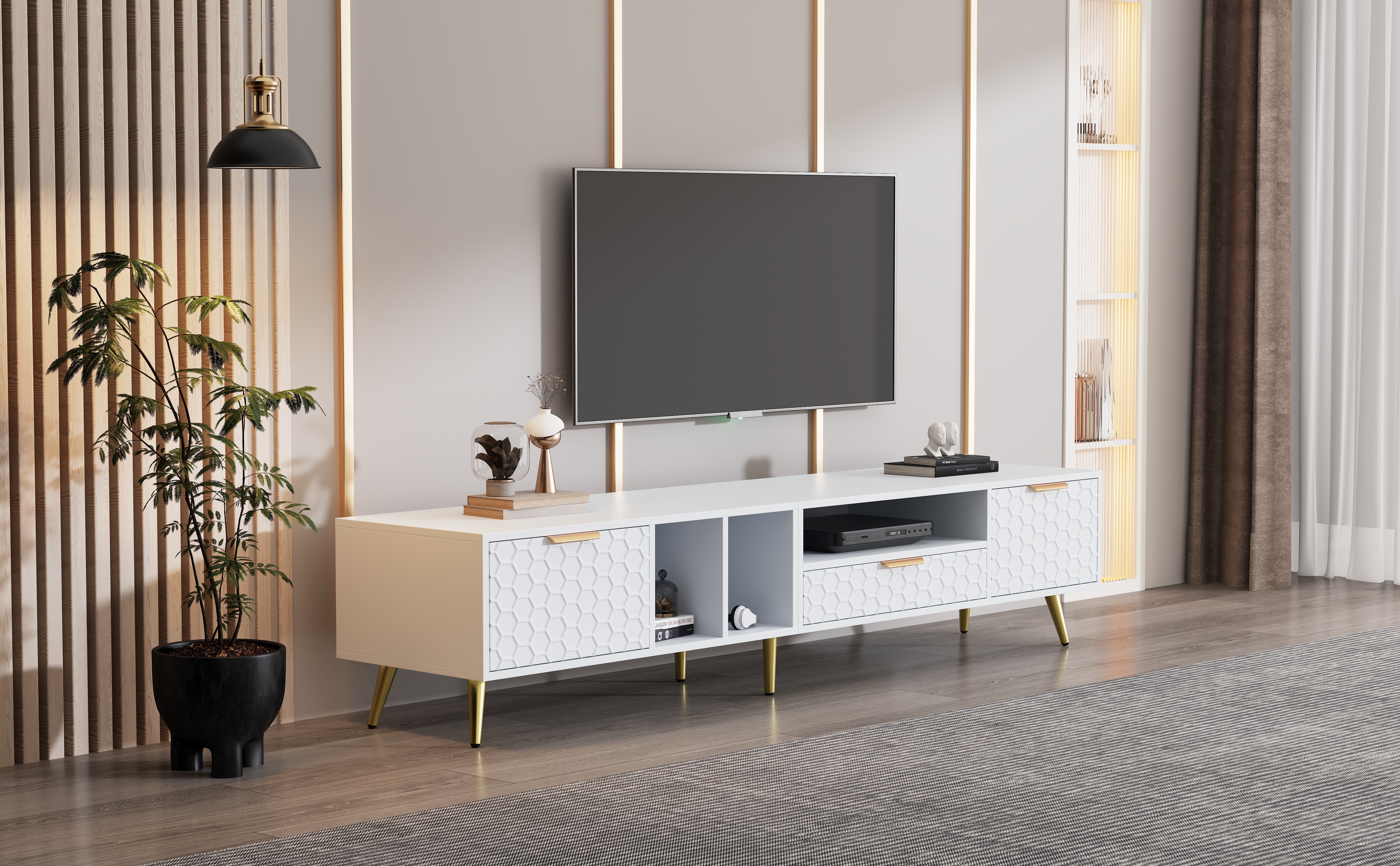 Construction durable et stable : ce meuble TV est fabriqué en panneau de particules de haute qualité, durable et résistant à l'usure. Les portes des deux côtés et l'étagère ouverte offrent un espace de rangement idéal pour les appareils multimédias, les DVD et autres accessoires. Stabilité et durabilité : Le meuble est fabriqué en panneaux de particules et a une capacité de charge totale recommandée de 40 kg. Il supporte en toute sécurité les téléviseurs, décodeurs et autres appareils, vous permettant de les utiliser en toute confiance Meuble TV KAIRO 180 cm 4D fraisée blanc mat Avec une capacité de charge allant jusqu'à 60 kg, ce support TV convient aussi bien pour les grands téléviseurs que pour d'autres besoins de meubles. MERAX 200 cm Meuble TV élégant, Lowboard Blanc Brillant, éclairage LED Montage facile et sécurité : les instructions détaillées et le kit de matériel inclus permettent un montage rapide. En outre, l'armoire TV est équipée d'une sécurité anti-basculement qui assure plus de sécurité dans les maisons avec enfants ou animaux domestiques. Support TV Jusqu'à 200 Cm Merax Meuble TV De 180 Cm - Blanc - Avec Portes En Nid D Meuble Bas Salon Gestion pratique des câbles : équipé de trous de gestion des câbles à l'arrière, le support TV assure que vos câbles restent bien rangés et invisibles. Dimensions du produit (L x l x H) : 180 x 40 x 41 cm., Poids brut : 36,9 kg., Poids net : 34,9 kg., Charge maximale : 60 kg. Grand espace de rangement : avec ses dimensions de 180 4041 cm, ce meuble TV offre beaucoup d'espace pour les téléviseurs jusqu'à 80 pouces.