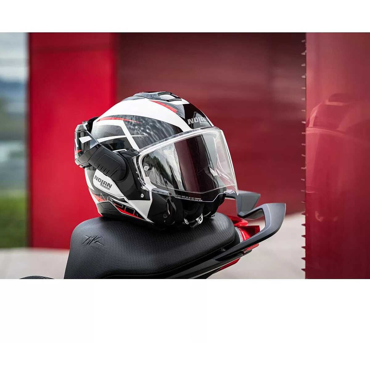 Système de rappel automatique : le casque est équipé d'un système de rappel automatique qui garantit la plus grande praticité et facilité de réglage de l'écran pare-soleil VPS en fonction de vos besoins., Polycarbonate Lexan , VPS (écran pare-brise) Speedway Nolan N120 1 Pack Casque Kit Bluetooth Et Intercom Nolan N120 1 Classic N Com Casque Nolan N120 E 1021307 Grâce à des tissus respectueux de l'environnement, votre casque vous protège, tout en contribuant à un environnement plus vert. Sublimation de la technologie et de l'innovation de l'entreprise de Brembate de Sopra. Avec un simple mouvement à rabat, ce design révolutionnaire offre la liberté d'un casque open face tout en conservant la sécurité et la polyvalence d'un casque intégral. N-com Ready Pack Casque + Kit Bluetooth Et Intercom : Nolan N120-1 Special N-Com 15 Nolan N120 1 Dual Action - Système d'ouverture de la mentonnière : découvrez la praticité du système d'ouverture de la mentonnière Dual Action, une technologie qui garantit un mouvement d'ouverture et de fermeture de la mentonnière extrêmement fluide, en s'adaptant à vos besoins de conduite avec précision et simplicité. Homologation UN/ECE 22-06 Homologation P/J N-Com Ready : restez toujours connecté et ne renoncez pas au divertissement pendant vos voyages grâce à cette technologie, qui vous permet d'intégrer parfaitement les systèmes de communication dans le casque vous permettant de rester en contact avec les autres motards, d'écouter de la musique ou d'accéder facilement à la navigation GPS. Vivez vos expériences sur la route en sécurité, confort et avec style Rotation à rabat de la mentonnière : le N120-1 introduit la technologie à rabat, une solution innovante avec mentonnière rabattable qui peut être tournée avec une facilité maximale en position arrière.