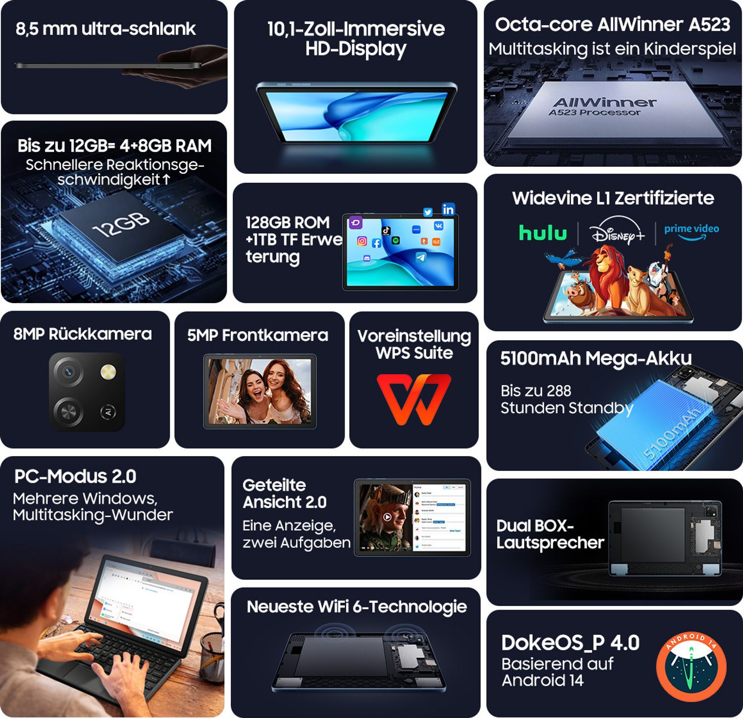 Qu'il s'agisse d'interactions avec votre famille, vos amis ou de paysages naturels, cela vaut la peine de les immortaliser avec l'appareil photo. De plus, vous pouvez insérer une carte SD pour faciliter encore plus le téléchargement de vidéos et le stockage de photos. Tablette Android 15 10 Pouces 64Go ROM 2To TF, Gemini AI, Octa-Core, 1280*800 FHD IPS, Veille Extra Longue, Bluetooth 5.0, 5G WiFi, Widevine L1, 5MP 8MP, Tablette avec clavier Souris et Cas, Rouge Regardez des vidéos YouTube ou des films Netflix sur un écran plus grand pour une expérience visuelle immersive. Le système est certifié WideVine L1, garantissant une navigation sécurisée et la protection de votre vie privée lors de vos activités en ligne. Tablette est équipée d'une batterie longue durée qui offre... 【Liberté d'utilisation + protection totale de la vie privée】La tablette S3 est facile à utiliser et pratique. Amazon Tablet Blackview Android 15 Tablet 2025, 12 Inch Android Tablet With FHD+2K Display, 24GB RAM + 256GB ROM, 9000mAh, Gaming Tablet With Pen &Case, Octa- Core Unisoc T615, Widevine L1, Google Le système protège entièrement votre vie privée et votre sécurité, vous permettant d'avoir un compte personnel exclusif. Vous pouvez modifier le thème du bureau, l'arrière-plan de l'écran et les icônes des applications. Tablette 10 Pouces 64Go WiFi 6 Octa-core Tablette 10 Pouces, Android 14 Tablette Tactile Avec 36 Go De RAM + 128 Tablette WiFi 6 Widevine L1 La caméra haute définition offre une expérience de prise de vue exceptionnelle. 【Dernier système Android 15 + processeur Octa-Core】 La tablette S3 est équipée du dernier Android 15., La vitesse du processeur de la tablette atteint 2 GHz, ses performances puissantes lui permettent de fonctionner à grande vitesse pour prendre en charge le travail et les jeux. Associée à un processeur haute vitesse de 2,0 GHz, la tablette peut effectuer sans problème des tâches telles que les jeux, l'automatisation bureautique et l'audio.