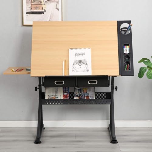 Cela assure la stabilité et l'horizontalité du plateau, grâce à un mécanisme rotatif qui maintient la table en place et évite les secousses et les glissements d'objets Dimensions du produit : 600 x 900 x 910 mm Même sur une surface inclinée, vos outils ne glisseront pas. Beaux Arts et Loisirs créatifs Découvrez notre offre Table à Dessin Inclinable 0° 90° VEVOR Bureau pour Dessinateur cadre en H Noir avec Plateau Marron en Bois Maison Bureau Même avec des livres, du matériel ou d'autres objets lourds, il reste plat sans se déformer. Même en cas d'utilisation intensive prolongée, la structure reste intacte sans se déformer Gardez le bureau sur une surface stable et pensez à l'ancrer au mur pour plus de sécurité. Capacité de poids impressionnante Dotée d'une structure de support en forme de H et de pieds métalliques renforcés, cette table à dessin peut supporter jusqu'à 40 kg, ce qui la rend idéale pour les équipements professionnels tels que les moniteurs et les outils de dessin. 1 x barre de support transversale, 4 pieds réglables, 10 vis M6 x 50, 5 vis M6 x 35, 2 vis M8 x 20 Ses pieds en métal sont fabriqués dans des matériaux de première qualité résistants à la rouille, assurant stabilité et fiabilité Elle réduit efficacement la fatigue des épaules, du cou et des yeux, favorisant une créativité plus concentrée et efficace Bureau à dessin, table à dessin réglable en hauteur, table à dessin, plateau à dessin inclinable avec verre trempé, table à dessin, bureau d'artiste avec 2 tiroirs/tabouret, pour œuvres d'art, co 2 écrous à serrage manuel M8, 4 vis M6 x 10, 1 clé hexagonale VISWIN Table à dessin en bois massif, bureau de dessin d'artiste, bureau d'écriture, bureau de studio, table d'artisanat avec hauteur réglable et plateau inclinable pour œuvres d'art, design graphique, lecture Dotée d'un grand plateau et d'une conception robuste, elle peut accueillir du matériel professionnel tout en offrant une excellente stabilité et durabilité. Capacité de charge de 40 kg : Les pieds en métal de haute qualité, associés à la structure en H, améliorent considérablement la stabilité et réduisent efficacement les oscillations. Pesant seulement 14,8 kg (32,6 lb), elle peut être facilement déplacée par une seule personne, ce qui permet de l'installer facilement dans différentes pièces de la maison selon les besoins. Caractéristiques principales Utilisation polyvalente Cette table à dessin est robuste et permet des réglages multi-angles. Soulagement de la fatigue oculaire et cervicale Dotée de six angles réglables, cette table de peinture est conçue pour favoriser une posture de lecture et d'écriture saine, réduisant ainsi les tensions cervicales. Utilisation polyvalente : cette table d'art est non seulement idéale pour le dessin, mais peut également servir de bureau, de bureau à domicile, de bureau d'ordinateur, de poste de travail artistique et plus encore, offrant une utilisation multifonctionnelle Grand plateau : La table à dessin de 600 x 900 mm est compatible avec les planches à dessin standard et offre un espace généreux pour du papier format A1, permettant ainsi de dessiner à main levée. Fiable et résistant à la rouille La table d'art est fabriquée en panneau de fibres denses offrant une excellente résistance à la compression. 1 x Manuel d'utilisation Bureau table à dessin inclinable Porte-stylo antidérapant Le porte-stylo intégré sur les bords permet de ranger crayons, gommes et autres outils de dessin. Conception légère Avec des dimensions de 600 x 900 x 910 mm (23,62 x 35,43 x 35,83 po), cette table à dessin est idéale pour les espaces moyens à petits. Ne pas dépasser la limite de poids de 40 kg. Pieds réglables : Les pieds réglables permettent de contrôler précisément la hauteur des quatre pieds, ce qui résout efficacement les problèmes liés aux sols irréguliers, en pente ou irréguliers.
