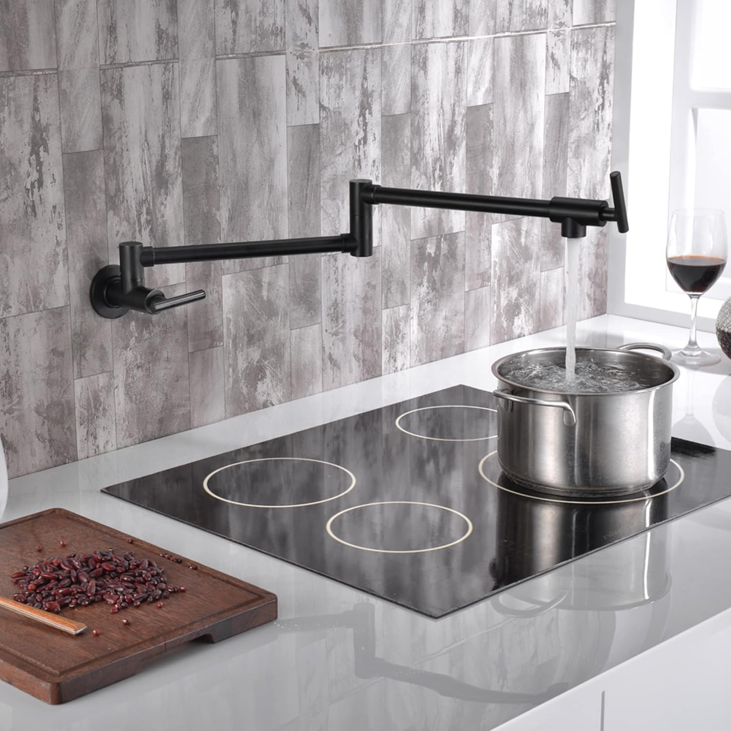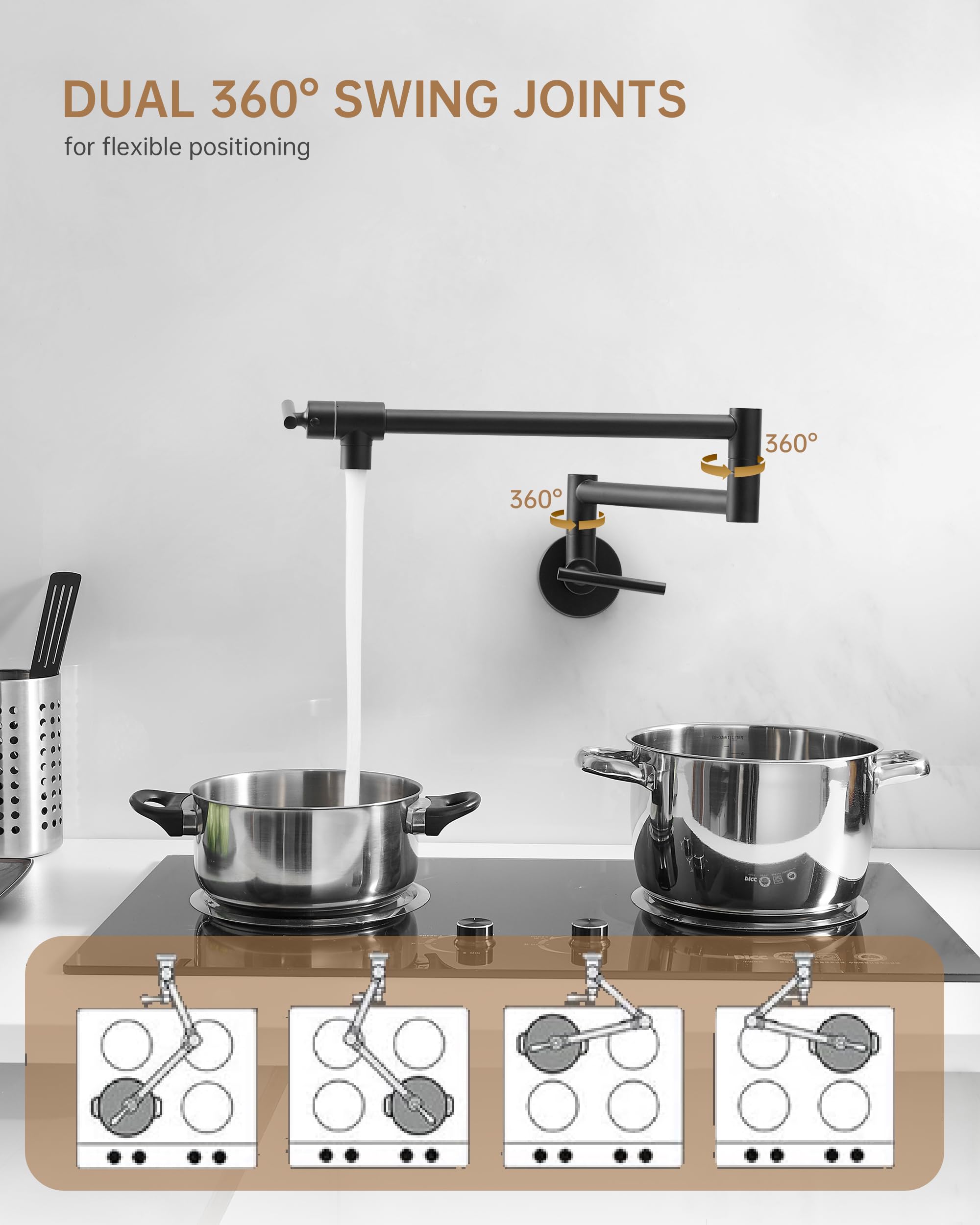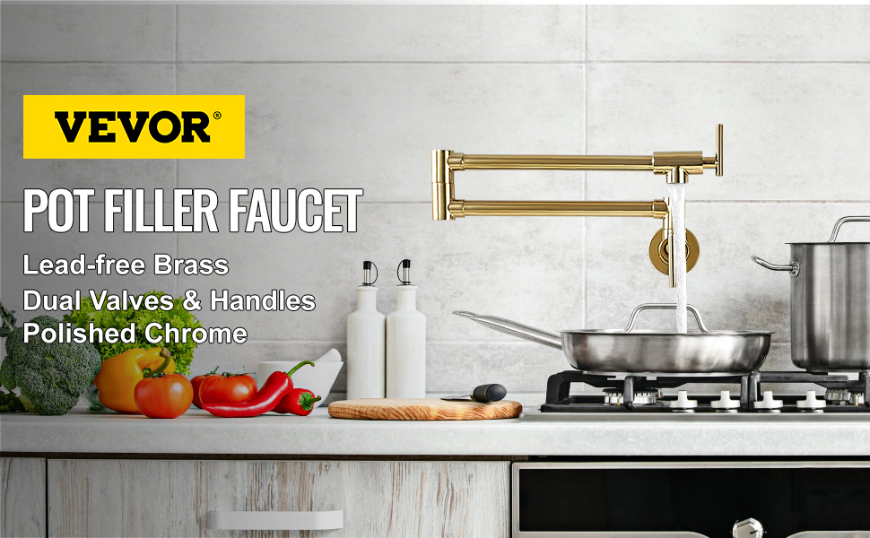 Robinet Design Moderne WHSHOWER Robinet De Remplissage De Casserole En Laiton à Montage Mural Pour Cuisinière Commerciale Robinet Pliable Avec Bras Oscillants à Double Articulation, Titane Doré Robinet Mural Cuisine Robinet de cuisine mural noir mat, robinet de remplissage de casserole en laiton pliable au-dessus de la cuisinière, robinet de casserole de cuisine avec bras pivotants à double articulation Design à deux poignées : le robinet a un bras pivotant à 360 °, deux poignées, jusqu'à 61 cm de long, peut couvrir plus de 4 cuisinières. Les casseroles peuvent être rapidement remplies sur la cuisinière sans avoir à marcher de l'évier au poêle Robinet de remplissage de pot Robinet remplisseur de pot mural noir et or GIMILI