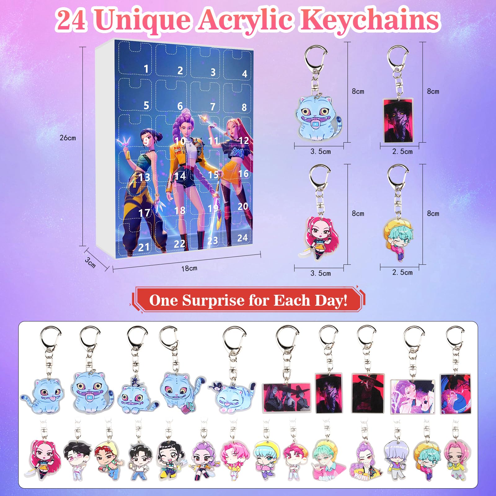 Plongez dans le monde de vos personnages préférés avec ce calendrier de l'Avent officiel 2025. Derrière chacune des 24 petites portes se cachent des mini surprises exclusives inspirées des designs emblématiques Huntrix Léger et portable : grâce à sa taille parfaite, ce porte-clés est léger et pratique à transporter sans alourdir vos affaires. Kpop Demon Hunters Jouet K-Pop H-Hunters Calendrier De L'Avent 2025 – Compte à Rebours Porte-clés Fan K-pop Cadeau Surprise Noël Hunters Calendrier de l'Avent 2025 Anime 24 jours KPOP, compte à rebours de Noël, porte-clés, pendentif acrylique, cadeau surprise de Noël pour les fans de K-pop Cadeau ultime : ce calendrier de l'Avent est un cadeau inoubliable pour les fans. Regardez vos yeux s'illuminer lors du déballage. Calendrier de l'Avent K-pop Demon Hunters • Petites Pirates Calendrier de l'Avent 2025 de Hunters Anime, 24 jours, KPOP Le design inspiré de l'anime est parfait pour les fans de designs mignons et créatifs, ce qui fait de ce porte-clés un accroche-regard qui reflète la personnalité et le style, peu importe où vous êtes. Accrochez-le à des clés, des sacs ou même comme fermeture éclair pour personnaliser les objets et les rendre facilement reconnaissables dans la foule. Design : avec son design ludique et expressif, ce porte-clés ajoutera un look à n'importe quelle occasion.