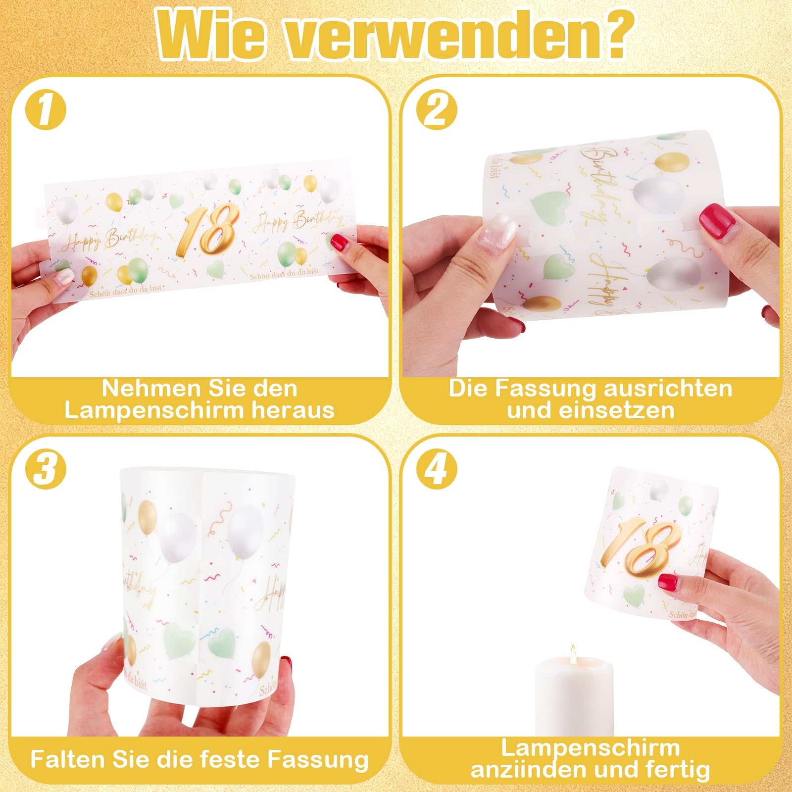 Remarque : les photophores sont conçus pour une utilisation en intérieur. Notre kit de décoration d'anniversaire doré est la solution parfaite pour créer une atmosphère luxueuse, joyeuse et confortable sans grand effort. Ambiance festive : les photophores avec bougies chauffe-plat (non incluses) créent une lumière merveilleusement chaude et accueillante. Cet ensemble convient non seulement pour la décoration, mais aussi comme cadeau pour les jubilars. Aspect de haute qualité : le design doré ajoute instantanément un caractère noble et festif à votre fête. Lot de Décorations d’Anniversaire 18 Ans avec Ballons et Bannière Happy Birthday par BELLE VOUS Les photophores sont imprimés avec l'inscription « Happy Birthday » et « Schön, dass du da bist ». Matériaux durables et respectueux de l'environnement : toutes les pièces sont fabriquées à partir de matériaux biodégradables respectueux de l'environnement avec une impression de haute qualité. Pack 12 photophores Joyeux anniversaire multicolores Idée Déco Anniversaire 18 Ans Lot De 133 Décorations D'anniversaire Pour 40 Ans - 20 Serviettes + 12 Photophores + 100 Décorations Colorées à Disperser + Chemin De Table - Élégante Décoration D'anniversaire Dorée Pour Femmes Et Decoration Anniversaire 18 Ans Fille Idéal pour les fêtes d'anniversaire, les fêtes surprises, les anniversaires, les séances photo et bien plus encore. Tout comme nos concurrents, nous vous proposons un kit complet soigneusement coordonné, mais avec un plus décisif : une nappe dorée exclusive pour une table parfaitement mise en valeur. 45 textes d annversare pour ses 30 ans enfn un e adulte – Artoft Caractéristiques du produit : Contenu : 1 nappe, 12 photophores, 20 serviettes, 1 sac de confettis Couleur : or élégant Matériaux : film (photophores), pâte (serviettes, confettis) Dimensions : 30 Nappe : 180 cm x 33 cm (dépliée) Serviettes : 33 x 33 cm (dépliées) / 16,5 x 16,5 cm (pliées) Photophore : 27 x 10 cm (déplié)/8 x 10 cm (plié) Confettis : différentes formes et tailles Avantages en un coup d'œil : Gain de temps et pratique : tout dans une boîte, pas besoin d'assembler des pièces individuelles. Kit complet de décoration d'anniversaire pour 18 ans : notre lot comprend un chemin de table doré supplémentaire (180 x 33 cm) qui, avec les 20 serviettes, 12 lanternes et 100 pièces de confettis, fera une décoration de table harmonieuse et luxueuse, parfait pour un 18ème anniversaire inoubliable., Anniversaire. Transformez votre table en scène festive pour chaque anniversaire. La combinaison d'or scintillant et de dictons chaleureux donne une appréciation émotionnelle et assure des visages éclatants