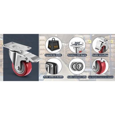 DIRECTION DOUCE --- Les roulettes de transport sont équipées d'une structure à double roulement à billes pour permettre un pivotement à 360° et une direction souple lors du déplacement d'objets lourds, ce qui améliore grandement l'efficacité de la manutention et permet de déplacer facilement des objets dans n'importe quelle direction. APPLICATION MULTI-SCÈNE --- Conception d'installation universelle pour les roulettes de 75 mm, peut correspondre à l'établi, aux vitrines, aux chariots à outils, aux étagères de stockage et à d'autres types de meubles et d'équipements qui doivent être déplacés, les familles, les supermarchés, les usines, la logistique et d'autres endroits sont applicables. EN STOCK : Set de 4 Roulettes pivotantes 75 mm avec frein - Roulettes pour meubles jusqu'à 50 kg par roue - Charge lourde - Caoutchouc pour intérieur et extérieur - Roues industrielles, MNLX601090360 pas cher. Livraison rapide partout en France MOUVEMENT SILENCIEUX --- Les roulettes avec freins fonctionnent en douceur et offrent une assise solide. Le traitement de surface antirouille permet aux roulettes d'être utilisées aussi bien à l'intérieur qu'à l'extérieur. Roulette pivotante 75mm en fonte pour charge lourde Les roulettes avec revêtement en caoutchouc protègent les sols. MATÉRIAUX CHOISIS --- Les roulettes pour charges lourdes sont fabriquées en alliage de zinc à haute résistance, avec un diamètre de 75 mm et une base épaissie, ce qui leur confère une excellente stabilité et une capacité de charge allant jusqu'à 200 kg. Roulettes Style Industriel Set De 4 Avec Frein - Roulettes Pour Meubles Jusqua 50 Kg Par Roue Charge Lourde Caoutchouc Pour Interieur Et Exterieur Roues Industrielles 88434044 Roulettes Pivotantes 75 Mm