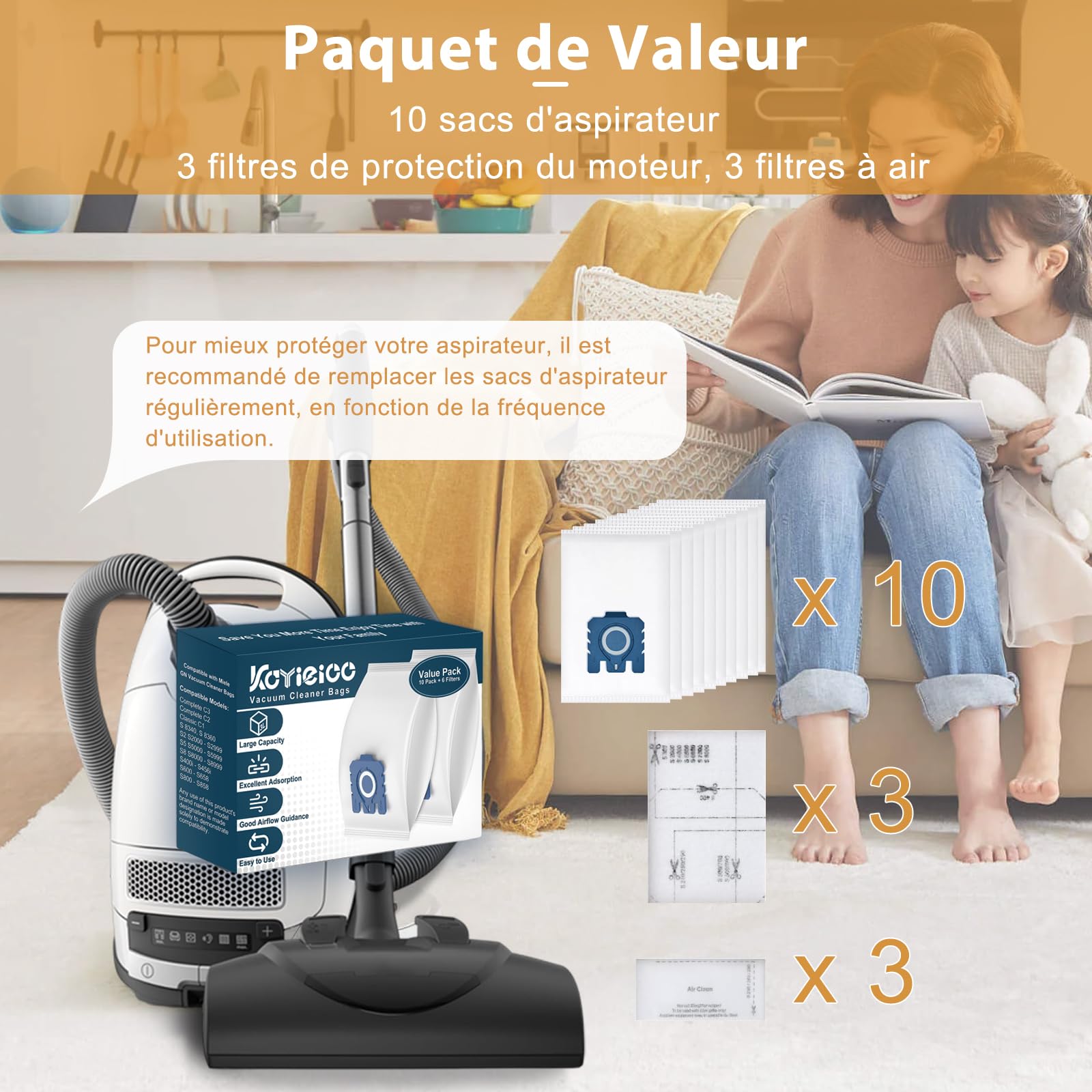 Le lot de 6 sacs est parfaitement compatible pour Miele. sacs aspirateur miele - Idee et astuce de la maison Les séries S400i-S456i, S600-S658, 5800-S858, S2000-S2999, S5000-S5999, S8000-S8999, Classic C1, Complete C1, Complete C2, Complete C3, S227, S240, S270, S280, S400, S2, S5 et S8., Veuillez vérifier le modèle avant de commander. Le sac d'aspirateur-traîneau contribue à améliorer la qualité de l'air intérieur pendant le nettoyage. Les sacs d'aspirateur 3D Efficiency sont dotés d'une structure élargie 3D améliorée qui retient 30 % de poussière et de débris en plus que les sacs standard. Changer Sac 10 Sacs D'Aspirateur Compatible Pour Miele Compact C 2 C2 C.2 C -2 - C Filtres MP AC Inclus Le retrait est simple et sans salissure, sans contact avec la saleté, pour un nettoyage plus hygiénique et sans effort. Le retrait est simple et sans salissures, pour un nettoyage plus hygiénique et sans effort., 4., Robustes et résistants aux déchirures : Les sacs sont fabriqués en fibres ultrafines et en ABS durable. Vous pouvez leur faire confiance pour les tâches de nettoyage difficiles., 5., Pack de 6 pratique et compact : Ce pack économique comprend 6 sacs de rechange, 2 filtres de protection moteur et 2 filtres à air. Les sacs sont fabriqués à partir de matériaux solides et indéchirables, capables de supporter les tâches de nettoyage les plus exigeantes. Sacs D'aspirateur De Rechange AirClean 3D Efficiency Pour Miele Type GN Compatible Avec Miele S2s5s8classic C1complete C2 Et Complete C3 Series 10 Dust Bags4 Filter Cotton1 Brush 88257503 Le pack économique comprend : 6 sacs de rechange 2 filtres de protection moteur 2 filtres de nettoyage d'air Matériau : fibre fine avec système anti-poussière ABS (rouge) Les sacs d'aspirateur 3D Efficiency présentent une structure élargie 3D améliorée qui retient 30 % de poussière et de débris en plus que les sacs standard., 1., Ajustement parfait : le lot de 6 sacs d'aspirateur est parfaitement compatible pour Miele S400i-S456i, S600-S658, 5800-S858, S2000-S2999, S5000-S5999, S8000-S8999, Classic C1, Complete C1, Complete C2, Complete C3, S227, S240, S270, S280, S400, S2, S5 et S8., Veuillez vérifier le modèle avant de commander., 2., Filtration avancée de la poussière : sa conception multicouche retient les poussières fines, la saleté, les débris et les allergènes. 6 Sacs Pour Aspirateur Pour Miele Gn Hyclean 3D Efficiency Complete C3...