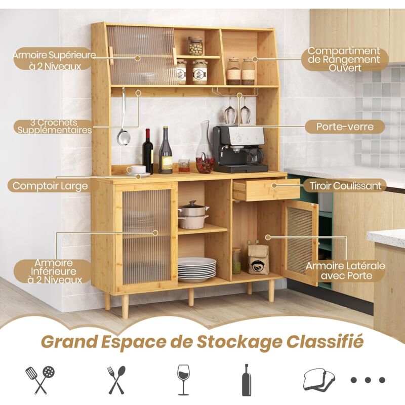 2 portes coulissantes pratiques : Permettent une ouverture et une fermeture faciles, protégeant vos objets tout en offrant un accès rapide et simple. Points forts du produit :- meuble intemporel, adapté à tous les espaces de vie- 2 portes coulissantes pour une ouverture et une fermeture faciles- 2 grands et 6 petits compartiments à l'intérieur- peut également être utilisé comme buffet dans le salon- assemblage rapide- nettoyage sans effort- maintien stable par 4 piedsMatière :- corps : MDF effet bambou- portes : bambou- pieds et structure : métalDimensions :- totales (lo x la x ha) : 100 x 40 x 80 cm- hauteur de la porte : 60 cm- hauteur des pieds : 17 cmCouleur :noir / naturelContenu de la livraison :1 x armoire d'appointProduit de la marque :[en., casa] VASAGLE Meuble de Rangement, Buffet Cuisine, Commode, avec 2 Portes Coulissantes, 33 x 100 x 80 cm, Étagères Réglables, pour Salon, Marron Rustique et Noir d'encre LSC092B01 10€ sur SoBuy® FSB59-N Meuble Bas Meuble Colonne Placard de Rangement... 8 compartiments de rangement spacieux : Comprend 2 grands et 6 petits compartiments, idéals pour organiser couverts, assiettes, verres, livres et autres objets du quotidien. Bahut en chêne avec portes coulissantes SAINBIOSE - DELORME meubles Stabilité assurée par 4 pieds robustes : Fabriqué en métal, les pieds garantissent une excellente stabilité même lorsque l'armoire est entièrement chargée. Montage rapide et surface facile à entretenir : Livré avec tout le matériel nécessaire et des instructions détaillées pour un assemblage simple; se nettoie facilement avec un chiffon humide. Buffet Haut En.casa] Buffet Avec Portes Coulissantes Armoire D'Appoint Meuble Bas Placard Vaisselier Commode Avec 8 Compartiments Pour Salon Chambre Bureau Entrée MDF Bambou Métal 100 X 40 X 80 Cm Naturel Noir Buffet Bas Meuble élégant, adapté à tous les espaces de vie : Parfait pour le salon, la chambre ou le couloir, son design intemporel s'harmonise avec tout style de décoration. Pour un montage facile, l'armoire est livrée avec tout le matériel nécessaire et des instructions détaillées. Sa surface, facile à entretenir, se nettoie aisément avec un chiffon humide, éliminant poussière et salissures sans difficulté.