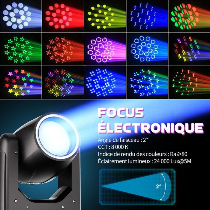 ❣️【Écosystème de Contrôle Intelligent】Prise en charge des protocoles d-mx512 (18CH)/RDM. Achetez 2 Pièces 250W 3-in-1 Lyre LED Tête Mobile, 9 1 Roue de Couleur 6 1 Gobos Rotatifs d-mx512/RDM Contrôle du Son Eclairage de Scène Wash pour Concert Club Mariage Soirée DJ Description du produit 250W 3-in-1 Lyre LED Indice de protection IP20 avec compatibilité bi-tension (110-240 V). ❣️【Longue Durée de Vie et Efficacité Energétique】La durée de vie de 50 000 heures des LED réduit la maintenance. Connectivité XLR 3 cœurs. ❣️【Performance de Qualité Professionnelle】Lumière blanche froide 8000 K avec IRC ≥ 85., Délivre 6500 lux à 5 m, idéal pour une projection de 5 à 10 m. Un BEAM puissant, du SPOT réussi et du WASH plus que satisfaisant. Intégrant un Zoom, 2 roues de Gobo dont une rotative, des gobos verre, un prisme rotatif réglable et bon nombre d’effets dynamiques faisant de cette nouvelle lyre une machine polyvalente 3-en-1 Notre lyre LED professionnelle combine trois fonctions essentielles (faisceau, motif, wash) dans un seul appareil compact, idéal pour créer des effets scéniques spectaculaires Le Designer Tient Une Roue De Couleur Dans Ses Mains. Style Art. Illustration Vectorielle Votre Conception Image255505766 Lyre Dj 250W 3-in-1 Lyre LED Tête Mobile, 9+1 Roue De Couleur 6+1 Gobos Lyre Beam Plusieurs modes : activé par la musique, maître/esclave, exécution automatique. Scénarios d'application: Éclairage de scène de concert Dynamique de piste de danse en boîte de nuit Il dispose d'un prisme à 5°, d'un effet brouillard, d'un zoom de 8° à 40° et d'une mise au point électronique pour des effets scéniques dynamiques. ❣️【Système Avancé de Couleur et de Motif】Roue chromatique 9+1, roue à motifs rotative 6+1, roue à motifs fixe 9+1., Créez des effets stroboscopiques à 30 Hz avec une gradation linéaire de 0 à 100 % et un angle de faisceau de 8° à 25° pour des scènes lumineuses polyvalentes.