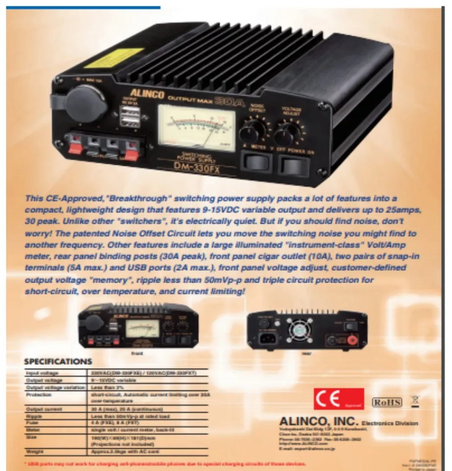 - Ventilateur réfrigérant - Prise allume-cigare avant avec une intensité maximale de 10 A. Indicateur analogique éclairé, indique la tension ou l'ampérage. DM-330-FXE ALINCO Fuente de Alimentación 30 amperios Découvrez l'alimentation Alinco DM-330FXE : 30A, tension ajustable, filtre anti-parasites RF, affichage analogique et silence total. Idéal pour radioamateurs exigeants - Variation de la tension de sortie : moins de 2 %. Fonte de Alimentação 220VAC ALINCO DM-330 FXE | Digital Eletrónica - Rádio CB e Amador | Componentes Eletrónicos La source d'alimentation alinco dm-330fxe est commutée, comprend un instrument pour pouvoir voir la tension et la consommation et est réglable Protégée contre les courts-circuits et l'intensité thermique, la surchauffe et la limitation automatique du courant pour des consommations supérieures à 30 A , Ventilateur de refroidissement Alimentation Commutée Alinco DM-330FXE - Netzgerät - Schaltnetzteil 30A Alimentation Labo Radio Amateur Protection Courte-circuit Protection contre les courts-circuits et l'intensité thermique, la surchauffe et la limitation automatique du courant pour une consommation supérieure à 30 A. - Tension de sortie : 9 – 15 V CC. Tension de sortie : 5 V CC.
