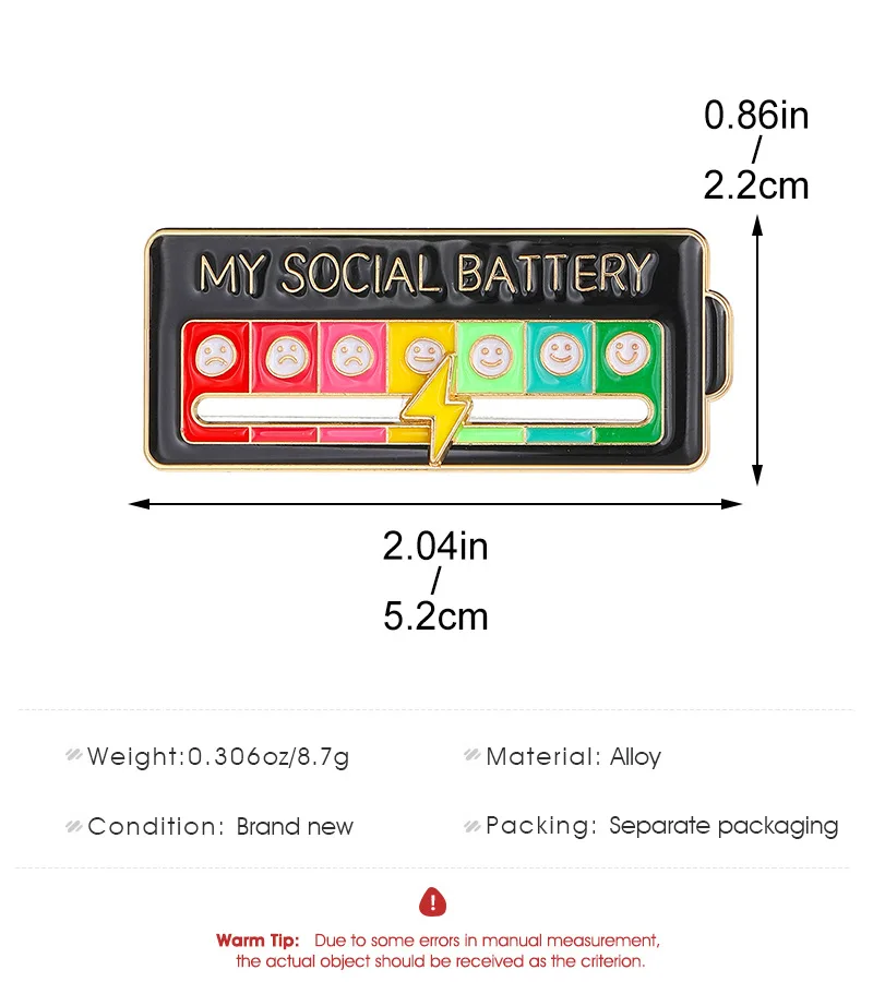Scénarios d'utilisation:Parfaite pour ajouter une touche personnelle à des vêtements, des sacs ou d'autres accessoires, que ce soit au quotidien, lors d'événements sociaux ou pour exprimer son état d'esprit de manière ludique. Youery Social Battery Pin, broche amusante pour l'humeur sociale pour 7 Achetez 2 PCS Épingle de Batterie Sociale, My Social Battery Pin, Broches Humeur Sociale Amusantes en Émail, Slider Créatif pour Femmes et Hommes, Cadeau Original 7 Jours par Semaine (Blanc Noir). Livraison gratuite sur une sélection d’articles dès 25€ d'achats Présentation du produit:My social battery pin avec design innovant de batterie, permettant d'exprimer son énergie sociale de manière personnelle et créative. Détails nets et couleurs vives. Disponibles en noir et blanc, ces épinglettes sont parfaites pour ajouter de la personnalité à votre sac à dos, vos vêtements ou vos bijoux Caractéristiques fonctionnelles:Broches amusantes grâce aux techniques de galvanoplastie et dépose de résine, les détails sont nets et les couleurs vives, assurant une esthétique longue durée. Spécifications : Matériau : Alliage de zinc Couleur : Blanc + Noir Procédé : Galvanoplastie, la dépose de résine Éléments populaires : Rectangulaire Fonctionnalité: Design coulissant innovant. Broche Sociale Batterie Curseur 2 PCS Épingle De Batterie Sociale, My Social Battery Pin Broches Social Battery